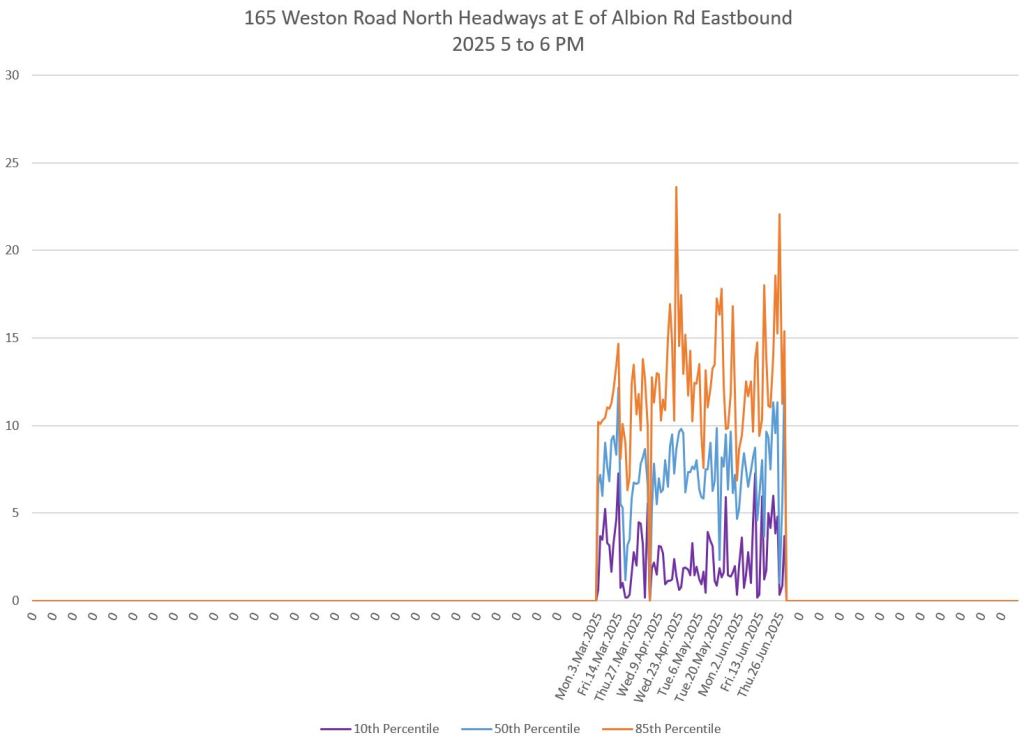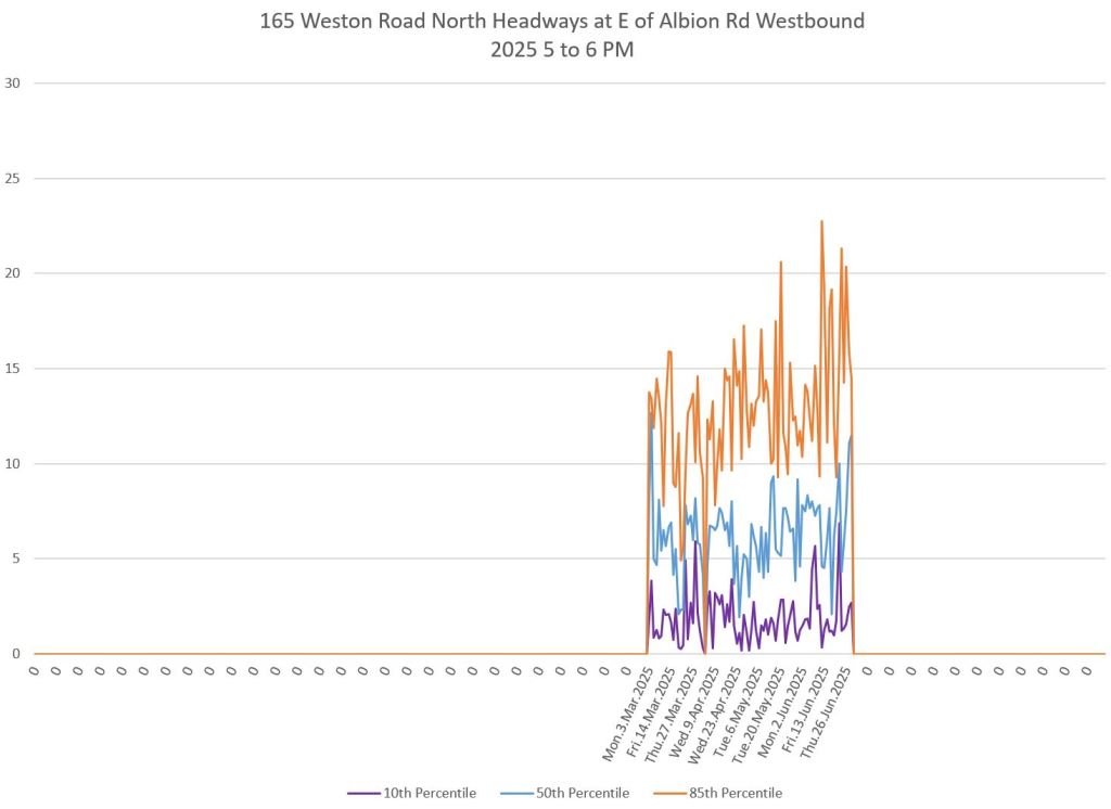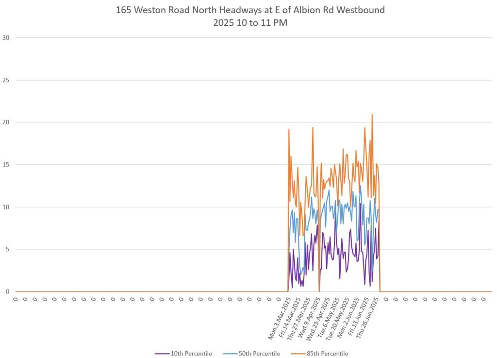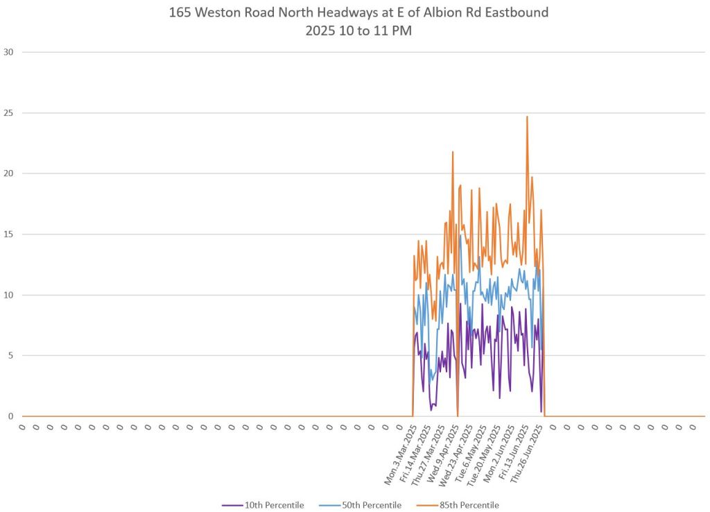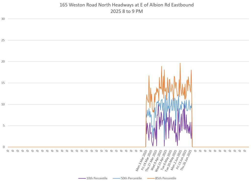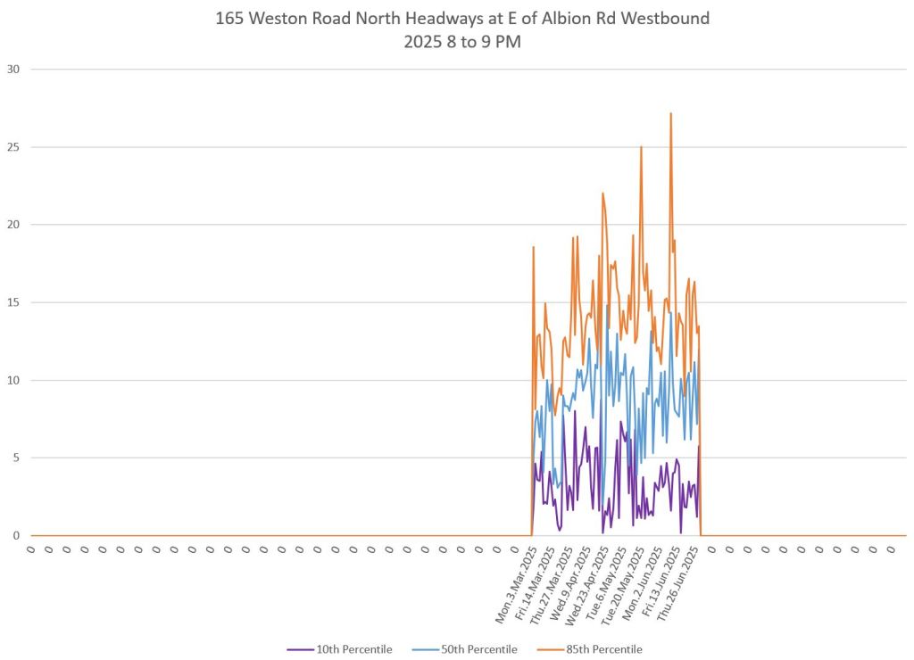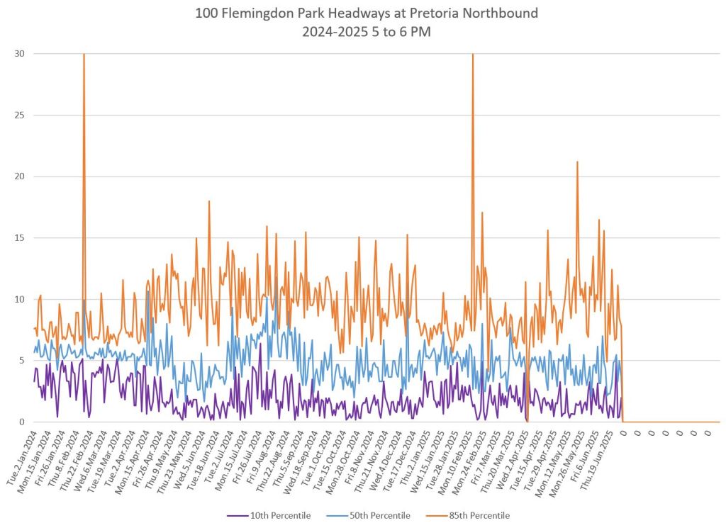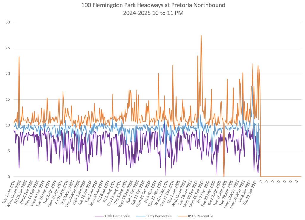 Leaving Bathurst Station in the AM peak, the spread from 10th to 85th percentile of headways is small although it becomes “spikier” through the Spring and Summer of 2024. There is a much broader range during the period when extras operated. They were fitted in at odd intervals between the basic 10-minute service making for a less regular headway and a low 10th percentile because the extras could run close ahead of or behind a scheduled run. The stats return to “normal” when the extra service disappears in April 2025.