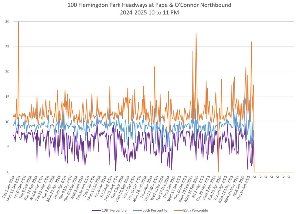 Headways northbound from Broadview Station lie in a fairly narrow band at the beginning of 2024, but the 10th percentile stays stubbornly low along the route. Bunching is common, although on a comparatively short 5’30” headway is harder to prevent. The rise in values in mid-2024 corresponds to the summer service reduction. No comparable change was made in mid-2025 and the winter schedule service levels remain in place.