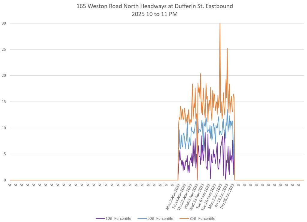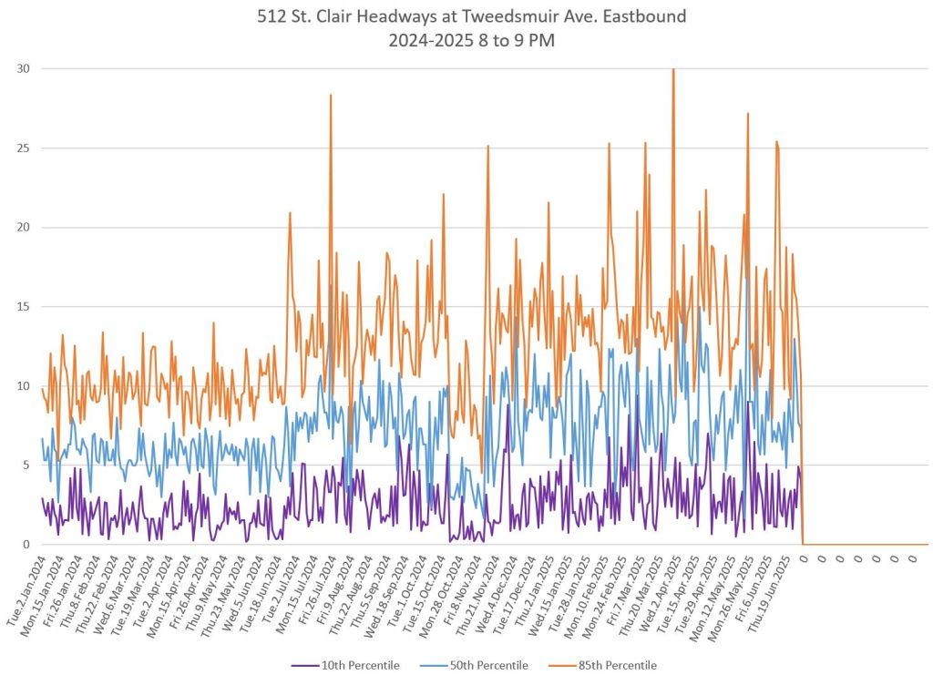 Eastbound service can be held for spacing at St. Clair West Station, but only if a westbound car does not appear wanting to pass onto its platform. Headway ranges at Tweedsmuir (the eastern portal of the station) have a wider range than at Dufferin through the day, and the low 10th percentile values shows that bunching persists on the eastern leg of the route well into the evening.