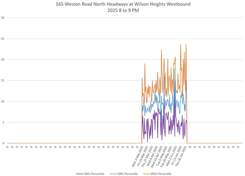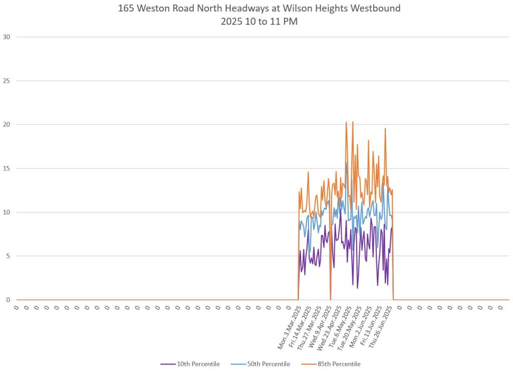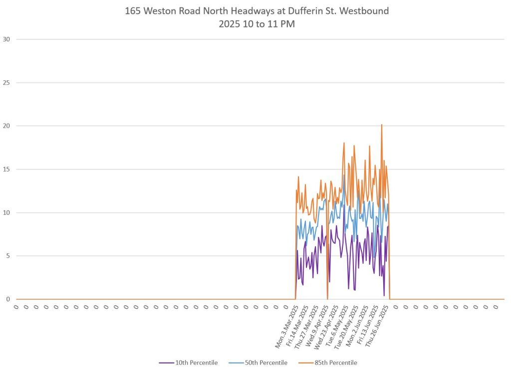 Service leaves Yonge Street westbound with headways grouped mainly 3-9 minutes. This spreads out further west on the route. Particularly notable is that there is no “reset” of vehicle spacing leaving Wilson Station, and the headways westbound at Dufferin are in a slightly wider range than at Wilson Heights east of the station. By the time service reaches Albion Road, the situation is even worse with the 10th percentile hugging the zero line and the 85th percentile consistently above 10 minutes showing that bunches and gaps are common.