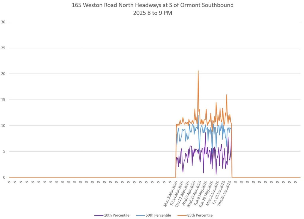 - Orange: 85th percentile to embrace all but the worst outliers of long headways (gaps)
