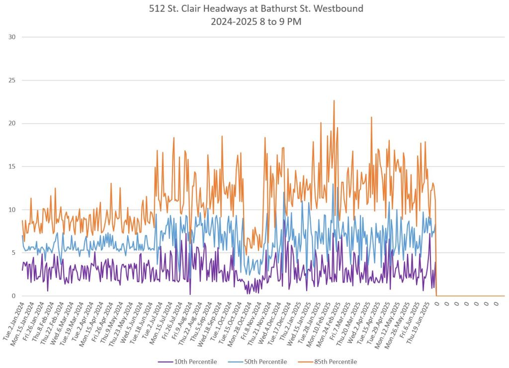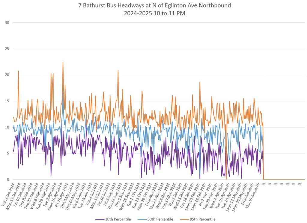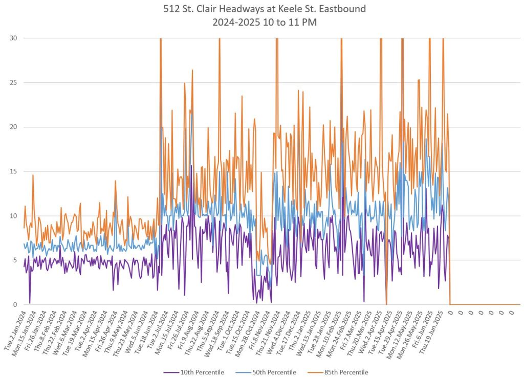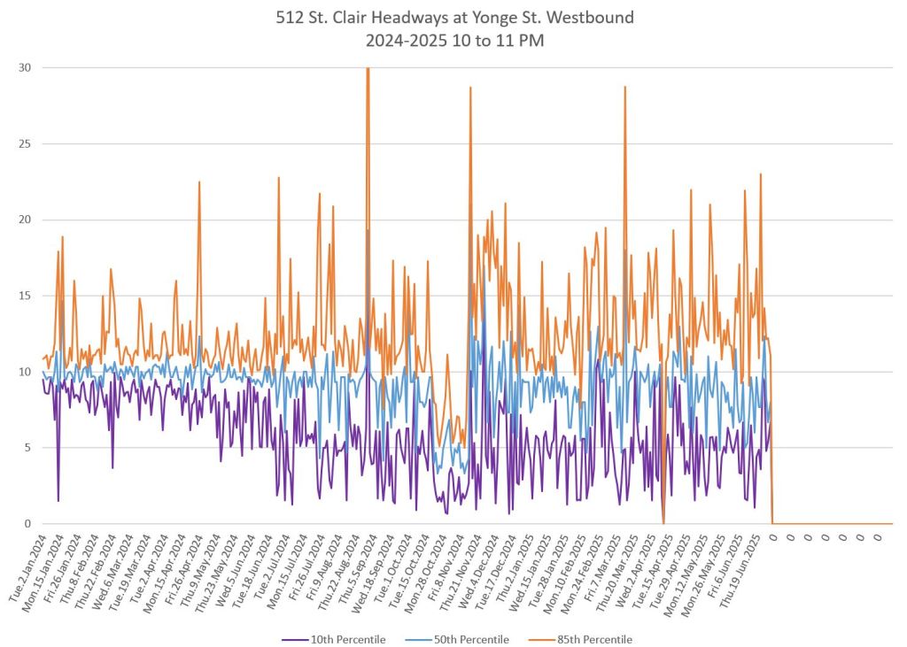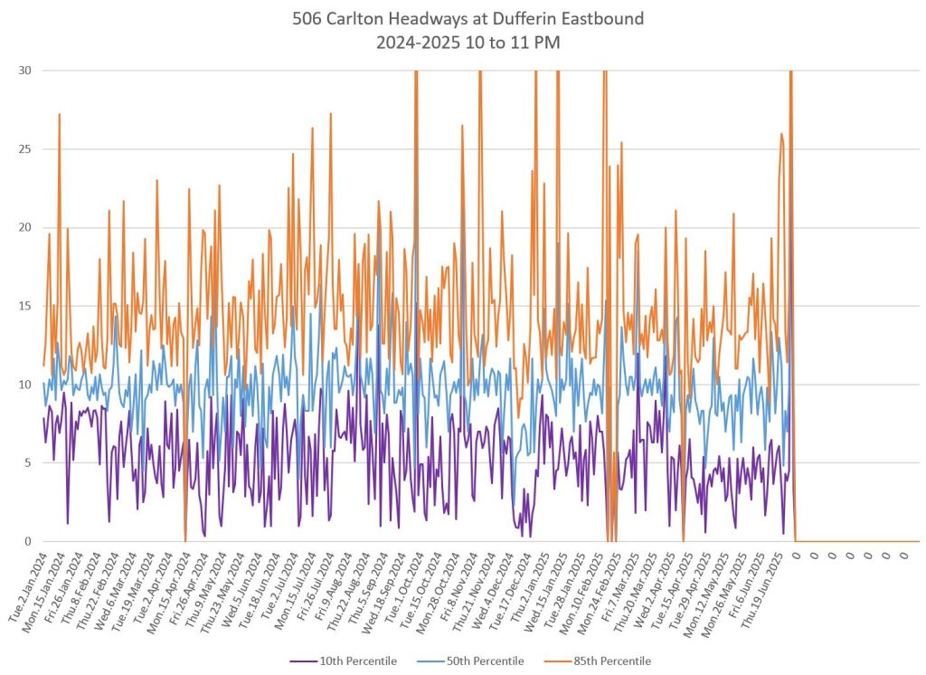 Quite bluntly, service on all of these routes was poor, well beyond the TTC’s own Service Standards, for 2024 and early 2025, and showed little sign of improvement through to mid-year. It will be interesting to compare whatever stats TTC comes up with to the performance shown on charts here.