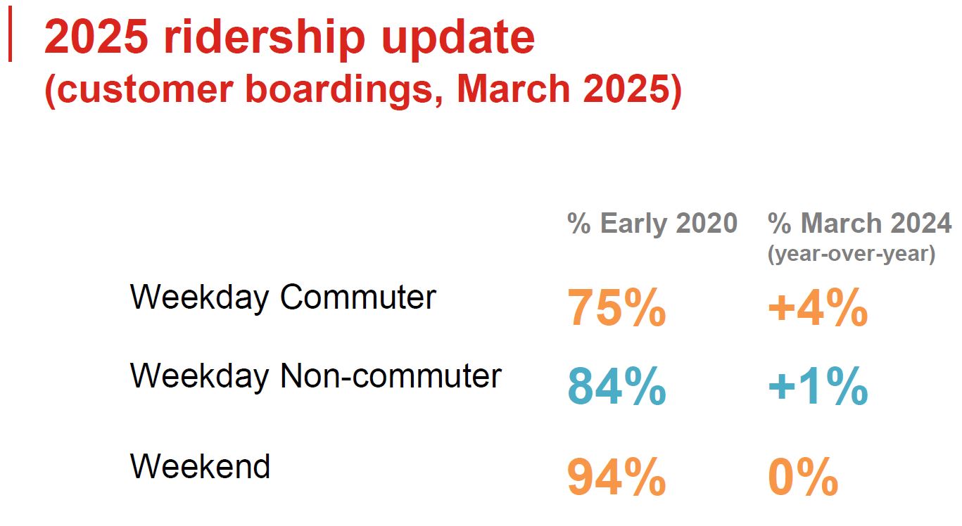 Ridership as of 2025 remains below historical pre-covid levels. The strongest recovery is on weekends at 94%, followed by non-commuter traffic at 84% and commuters at 75%. Note that “commuter” traffic is also affected by work-from-home which produces high transit demand on Tuesday through Thursday, but lighter demand on Monday and Friday. This is also reflected in general traffic levels. A commute trip can be avoided, especially for downtown office workers and to a lesser extent for students, but a trip for shopping, entertainment, visiting friends is by definition “in person”.