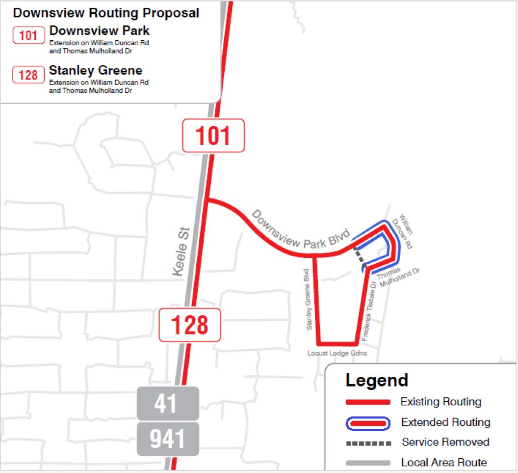- Extend 101 Downsview Park and 128 Stanley Greene to serve William Duncan Road.