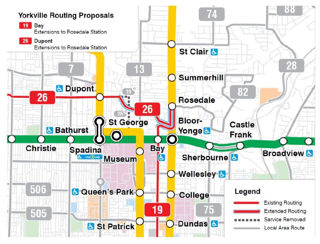 The TTC proposes to reroute both 19 Bay and 26 Dupont to serve Rosedale Station via Davenport Road and Yonge Street. This would remove service from the around-the-block loop via Dupont and Bedford used by 19 Bay, from Bedford south of Davenport and from St. George Station.