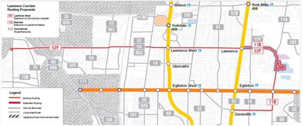 - Extend 52F Lawrence (the Royal York branch) to Sunnybrook Hospital, extend 11 Bayview from Sunnybrook Hospital to Lawrence Station, remove 124 Sunnybrook.
