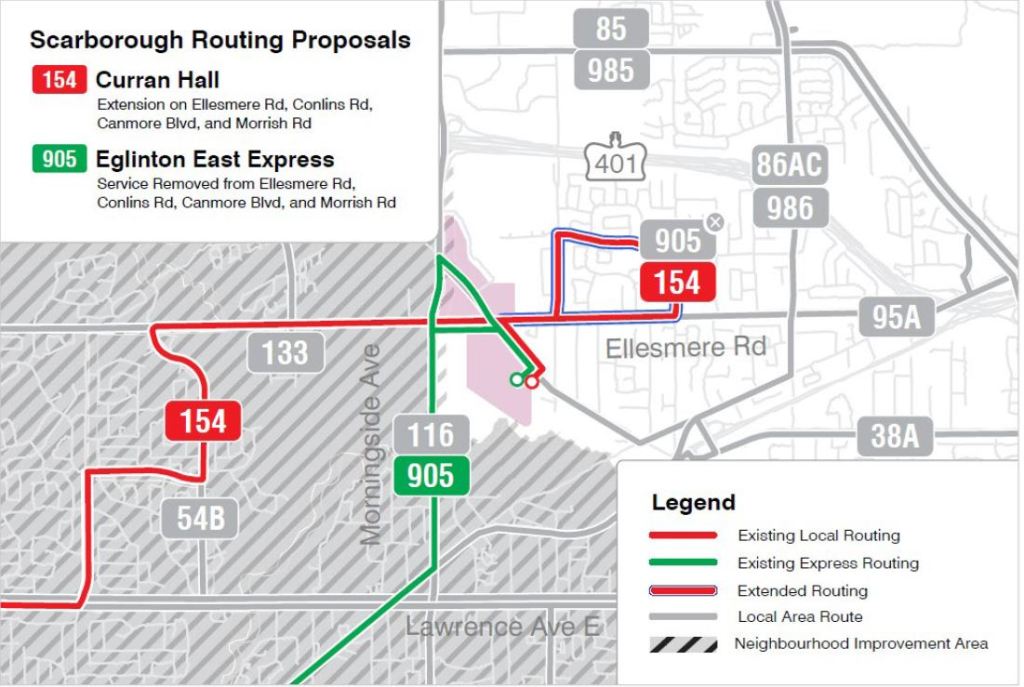 The TTC proposes that the 905 Eglinton East Express which now terminates at Conlins Loop would switch to ending at University of Toronto Scarborough Campus. The 154 Curran Hall bus would be extended to Conlins Road replacing the 905.