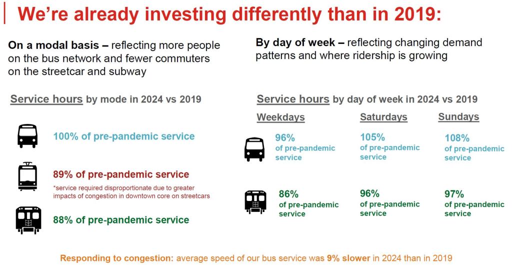 The Annual Plan includes a chart of service recovery levels. Note that these are measured in service hours, not by service frequency or capacity. Over the years, slower operation has stretched scheduled travel times, and one hour of service does not provide the same level of capacity or frequency to riders. On a route by route basis, the range of changes varies considerably. I explored this in You’re Not Crazy: TTC Service Is Worse back in January 2025.