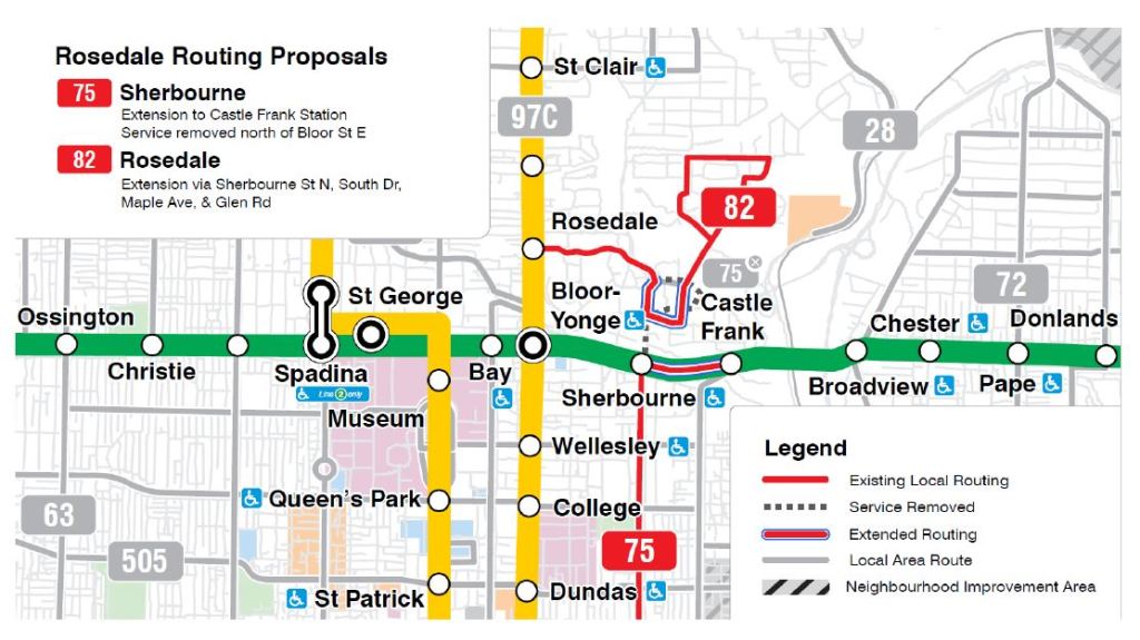 - Extend 75 Sherbourne to Castle Frank Station, and reroute 82 Rosedale to cover part of the northern portion of 75 Sherbourne.