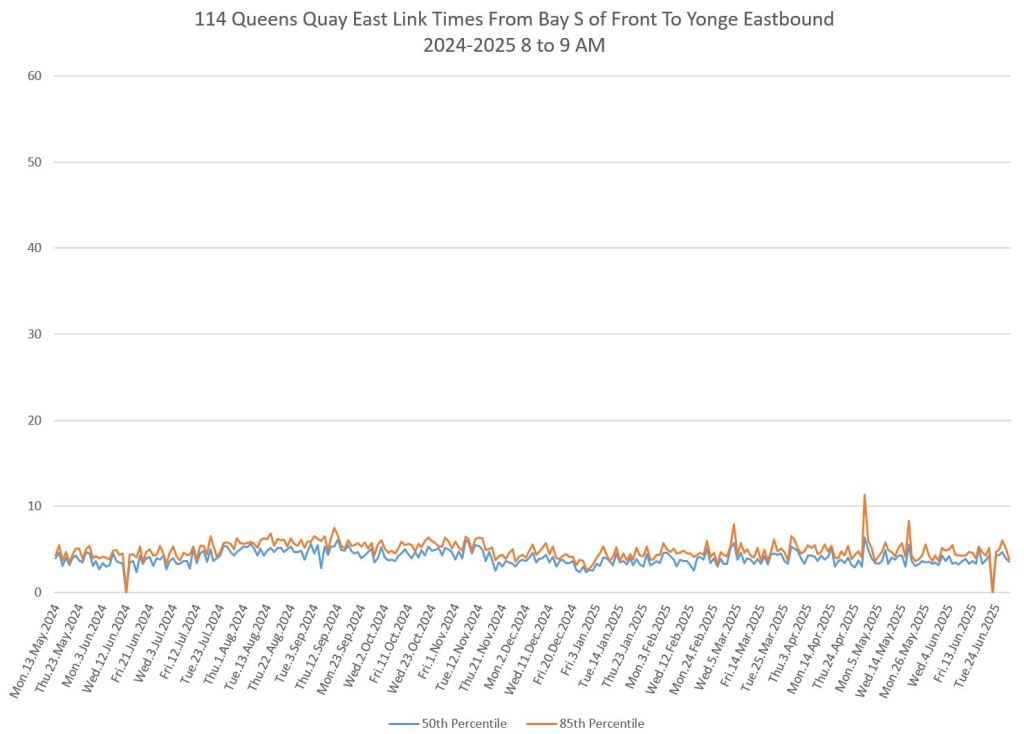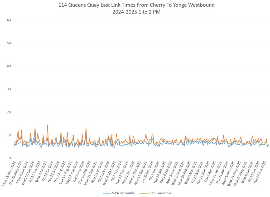 Now that the June 2025 tracking data are available, this article reviews the actual change, if any, in travel times and headway consistency. For historic context, the data presented here go back to May 2024 when the 114 Queens Quay East route was split off from the south end of 19 Bay.