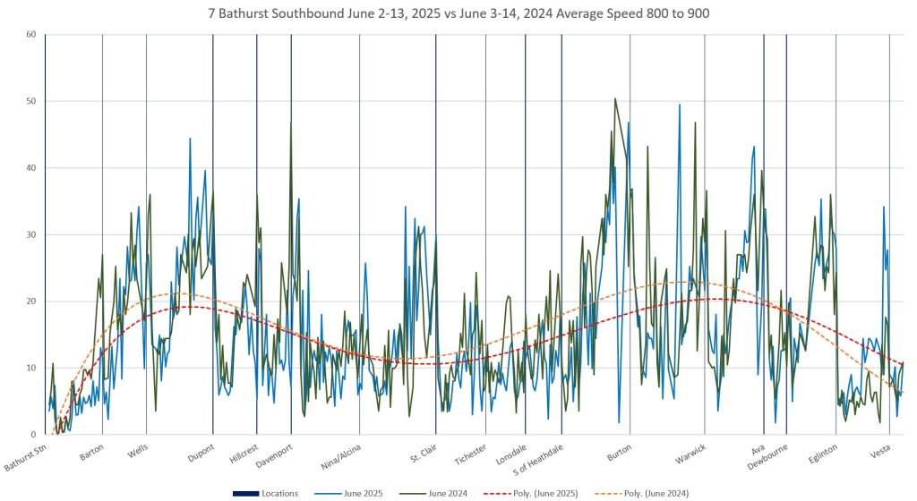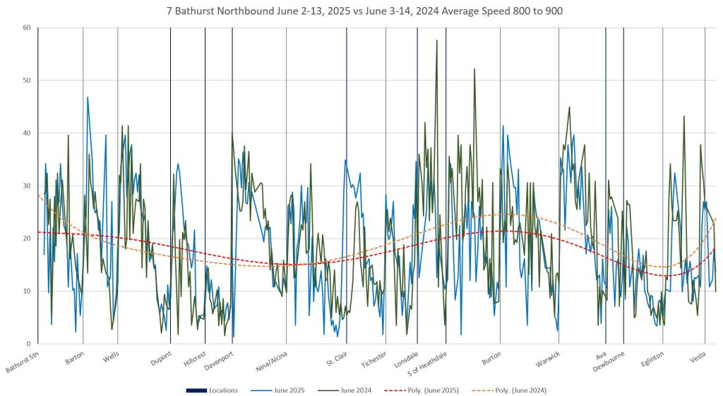 The first pair of charts below show the average vehicle speeds between Bloor and Eglinton both ways for the 10 weekdays from June 2-13, 2025, and by comparison for the ten weekdays June 3-14, 2024. In most cases there is little difference.