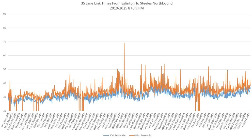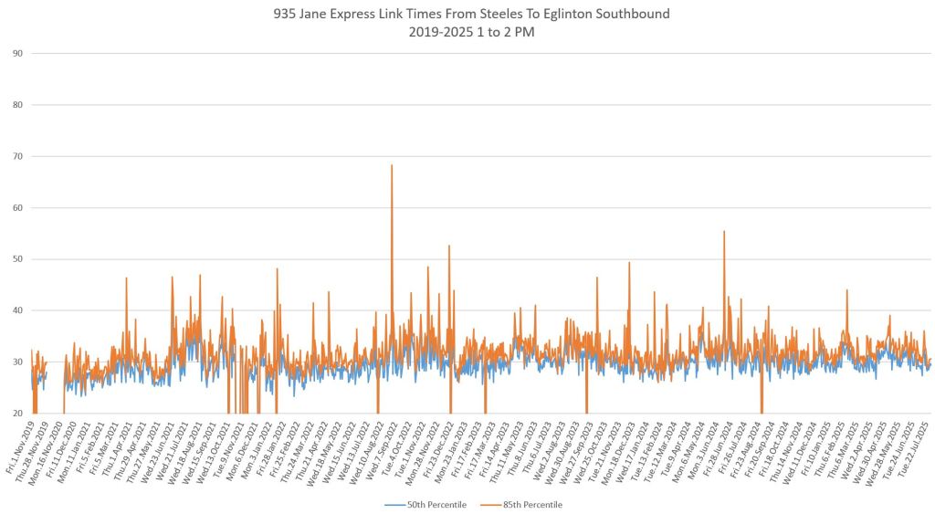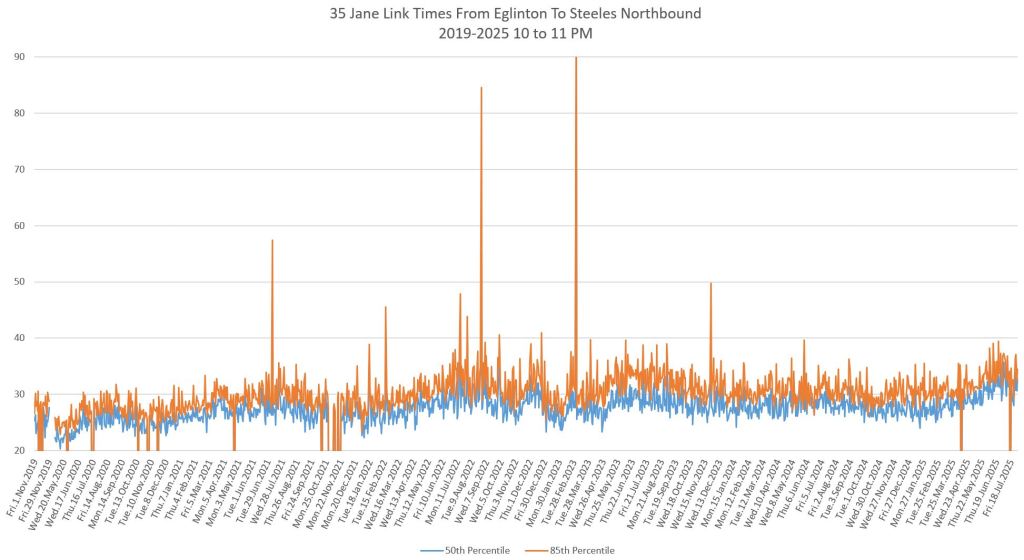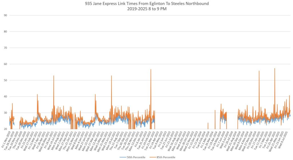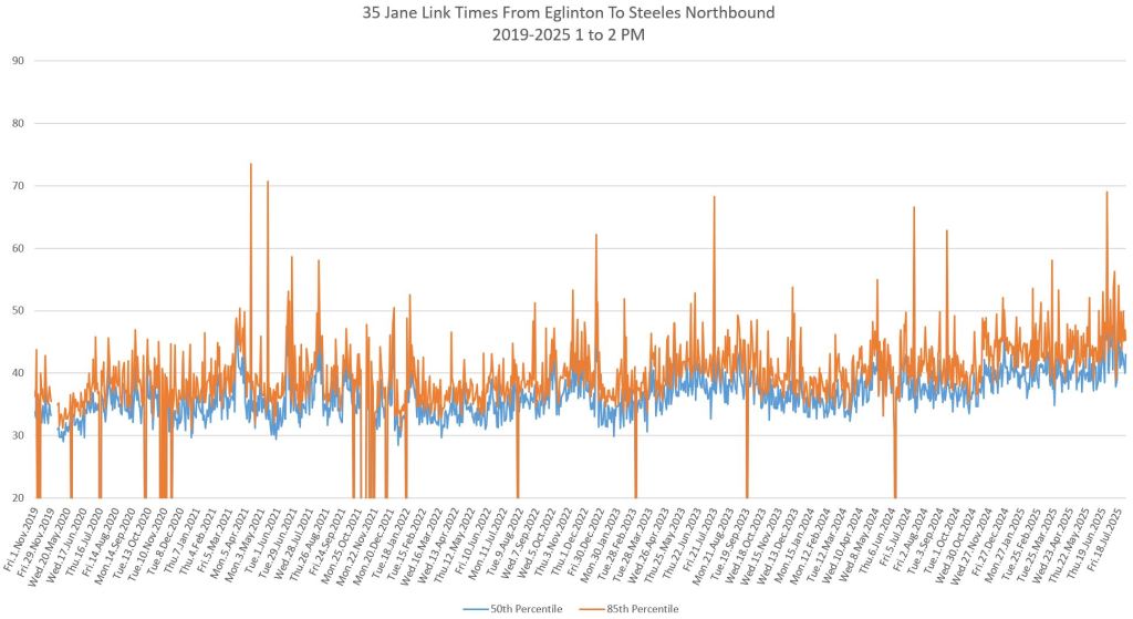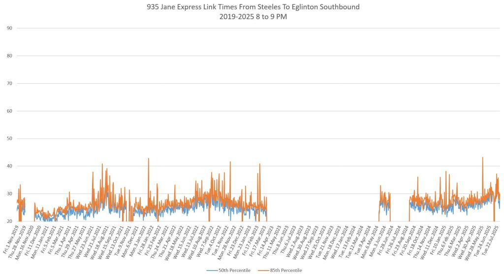 The remainder of this article updates previously published data about travel times on Jane starting just before the pandemic in November 2019 up to July 2025.