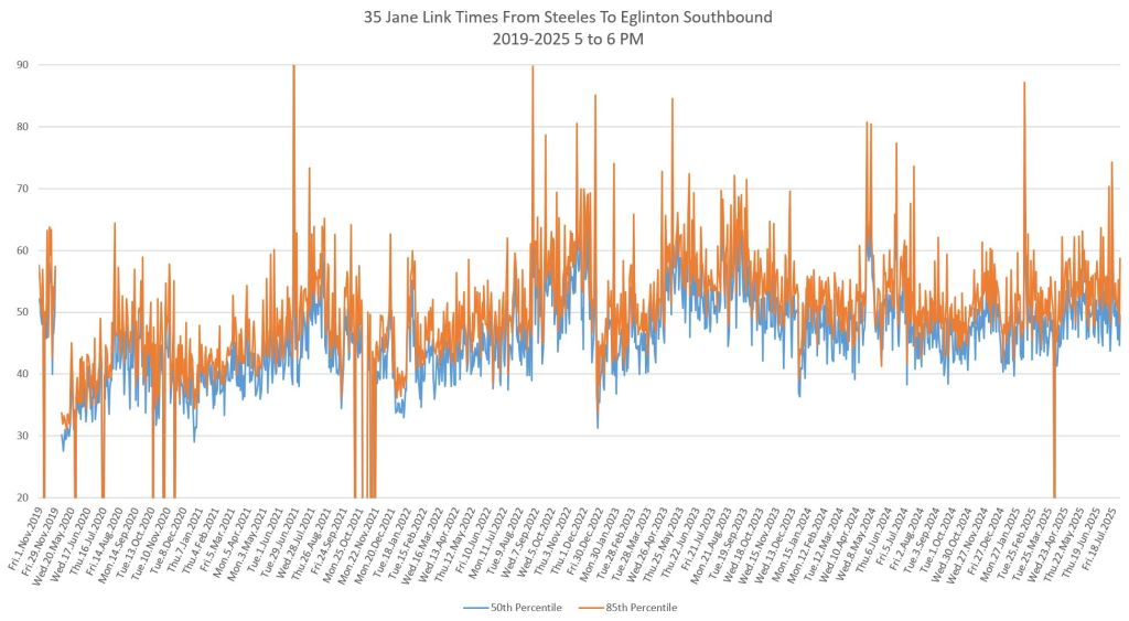 This article is an update from a previous review of travel times on the Jane corridor which is currently under study in the RapidTO program. Red lanes are proposed between Eglinton and Steeles both ways. The southern limit is defined both by the change in roadway cross section in the older part of the city, and by the future split in bus service at Eglinton to feed into Line 5 Crosstown.