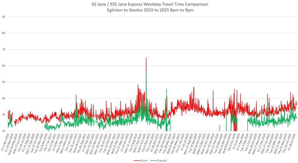 Comparison of Local and Express Travel Times on 35/935 Jane