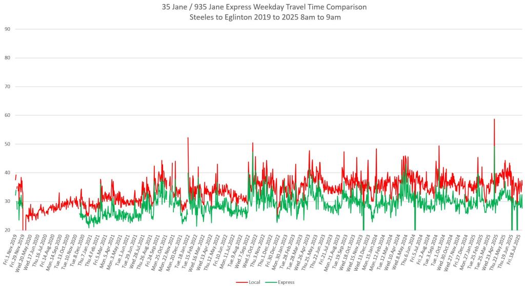 In the following charts, the upper red line shows the median travel time for the local service, and the lower green line shows the express service. The gap between them is the travel time saving for a trip over the full distance between Steeles and Eglinton. Short trips will have shorter savings.