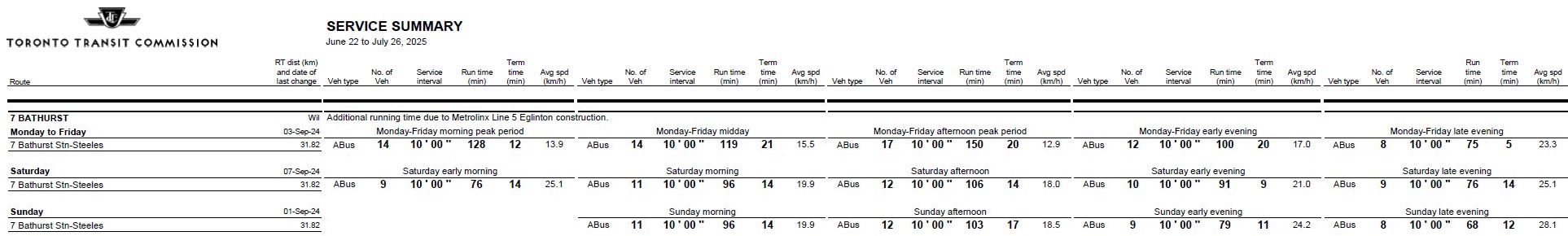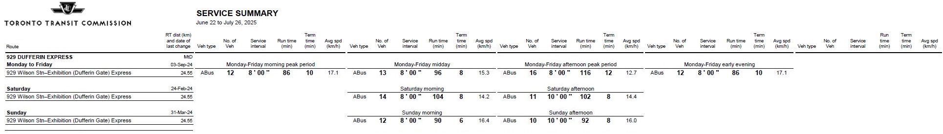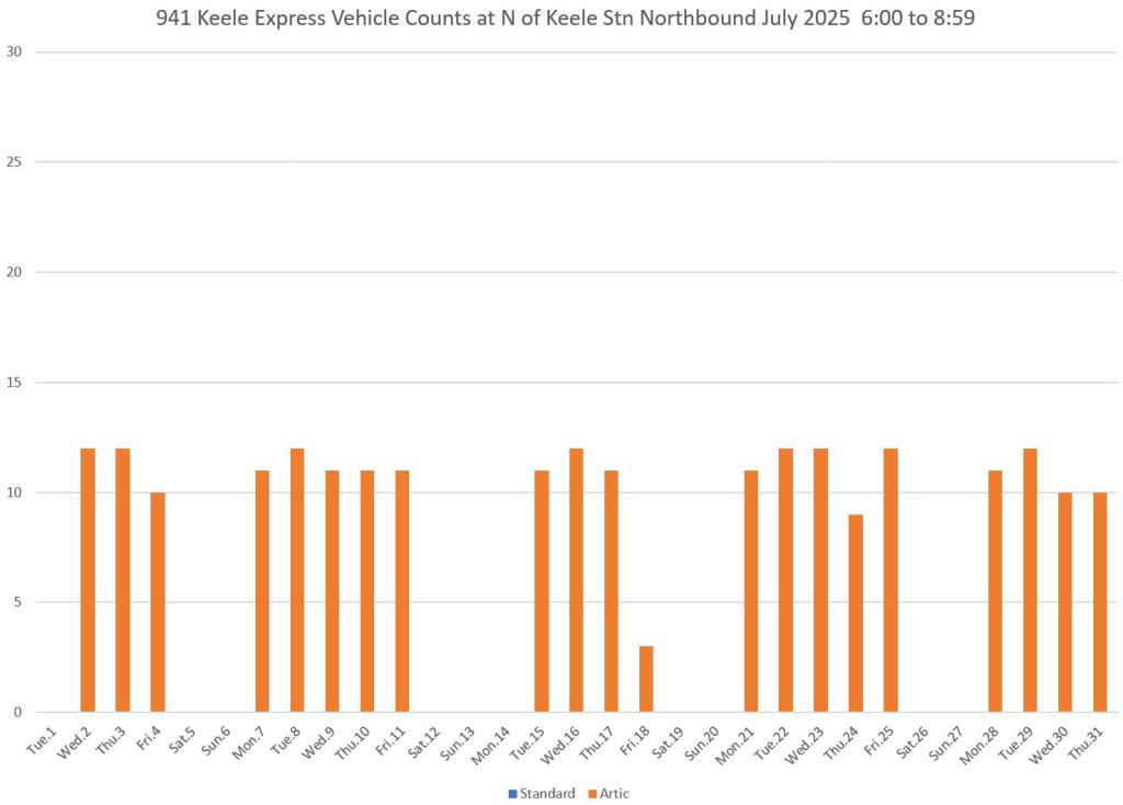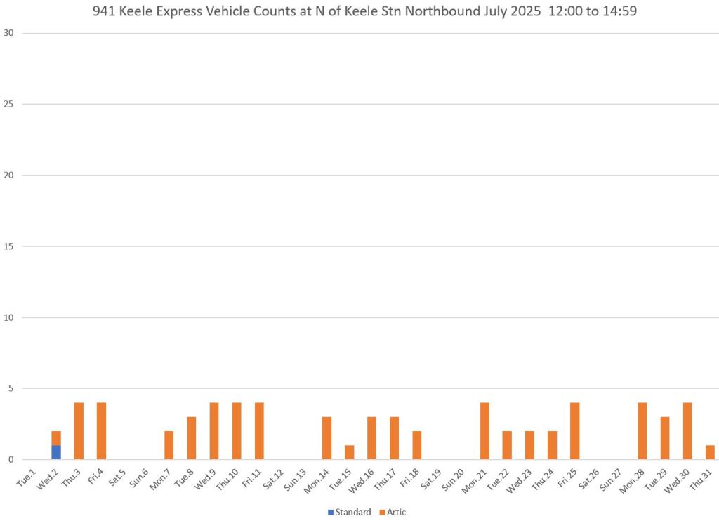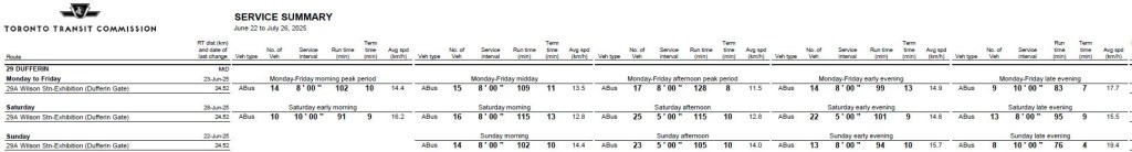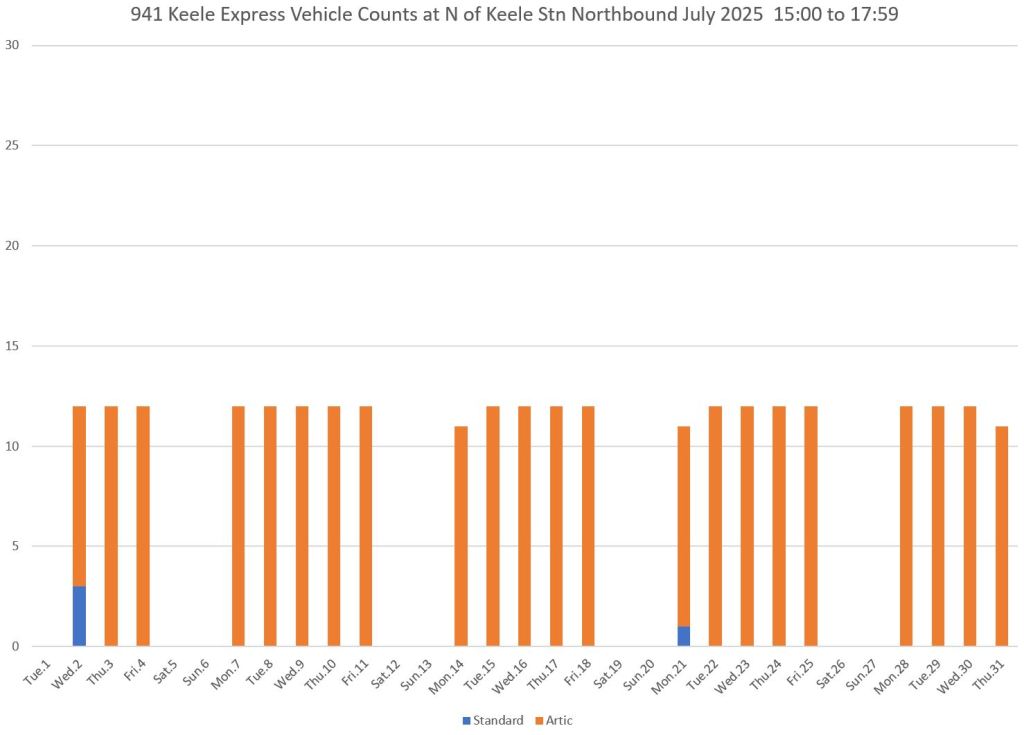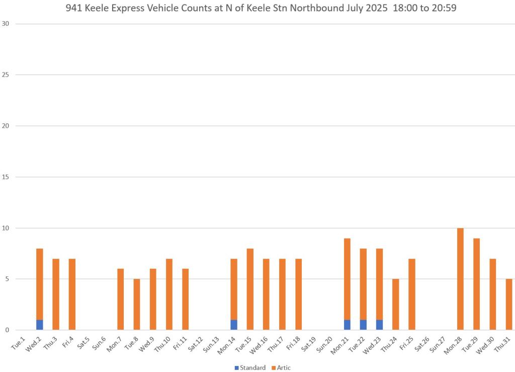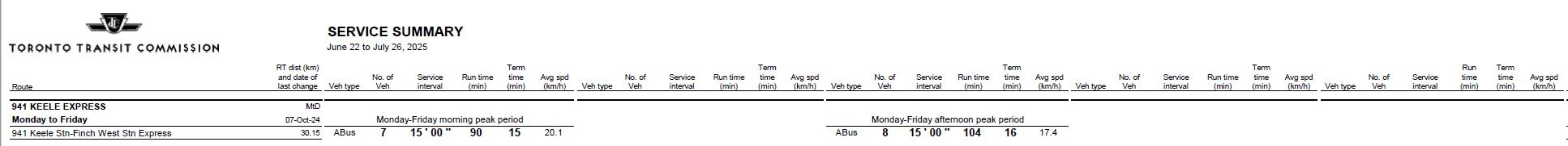 The Keele express service operates only in peak periods on a 15′ headway (12 buses in a three hour period). The afternoon peak service begins before 3pm and extends into the early evening.