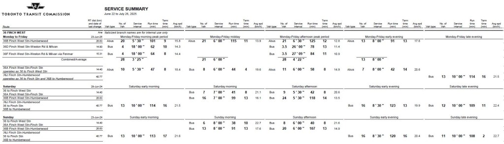 The Finch West bus has two branches that split off to serve an industrial district around Highway 400, but most of the service runs through to Humberwood Loop. On weekdays, the Humberwood 36B is scheduled to run with 18m buses, but on weekends with 12m buses.