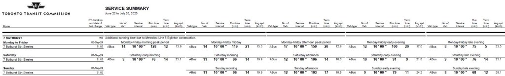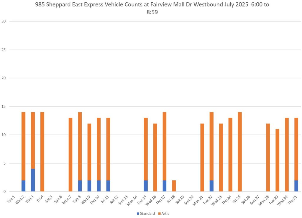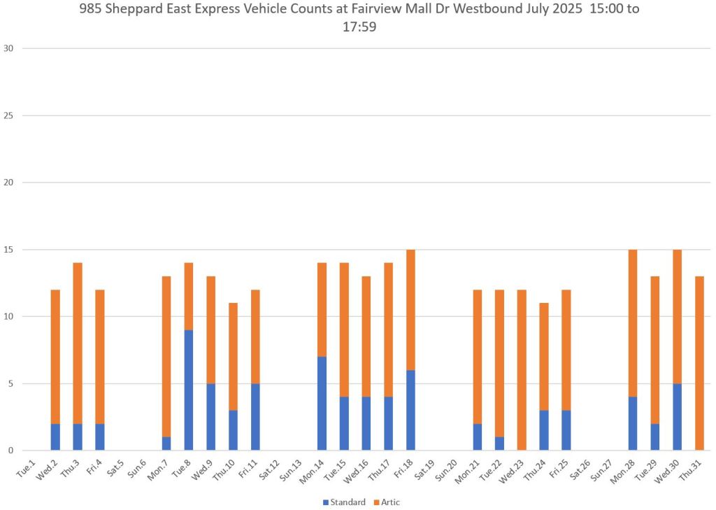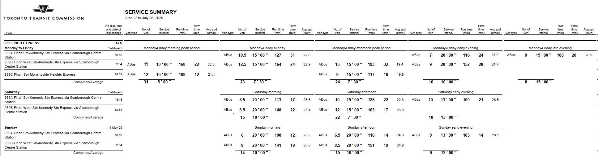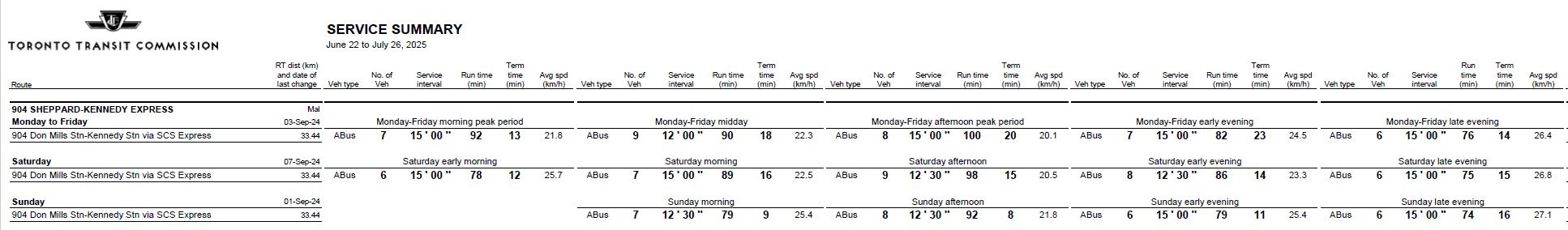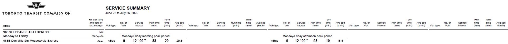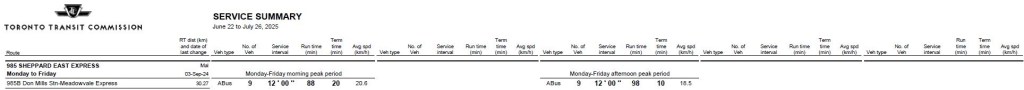 The Sheppard East express operates only in peak periods on a 12′ headway (5 buses/hour).