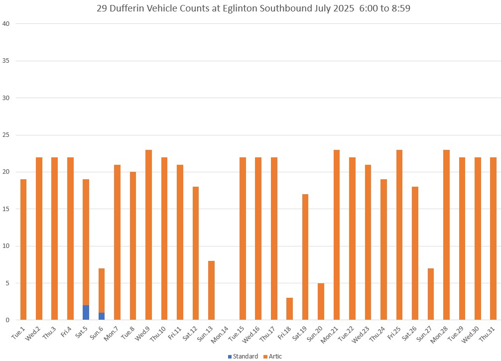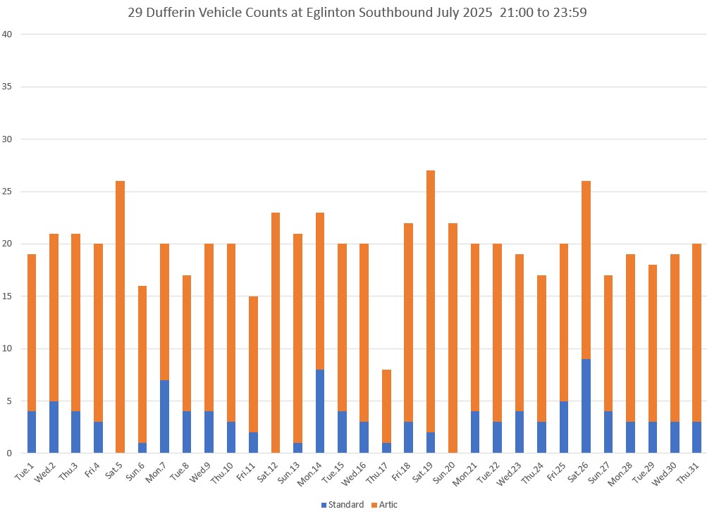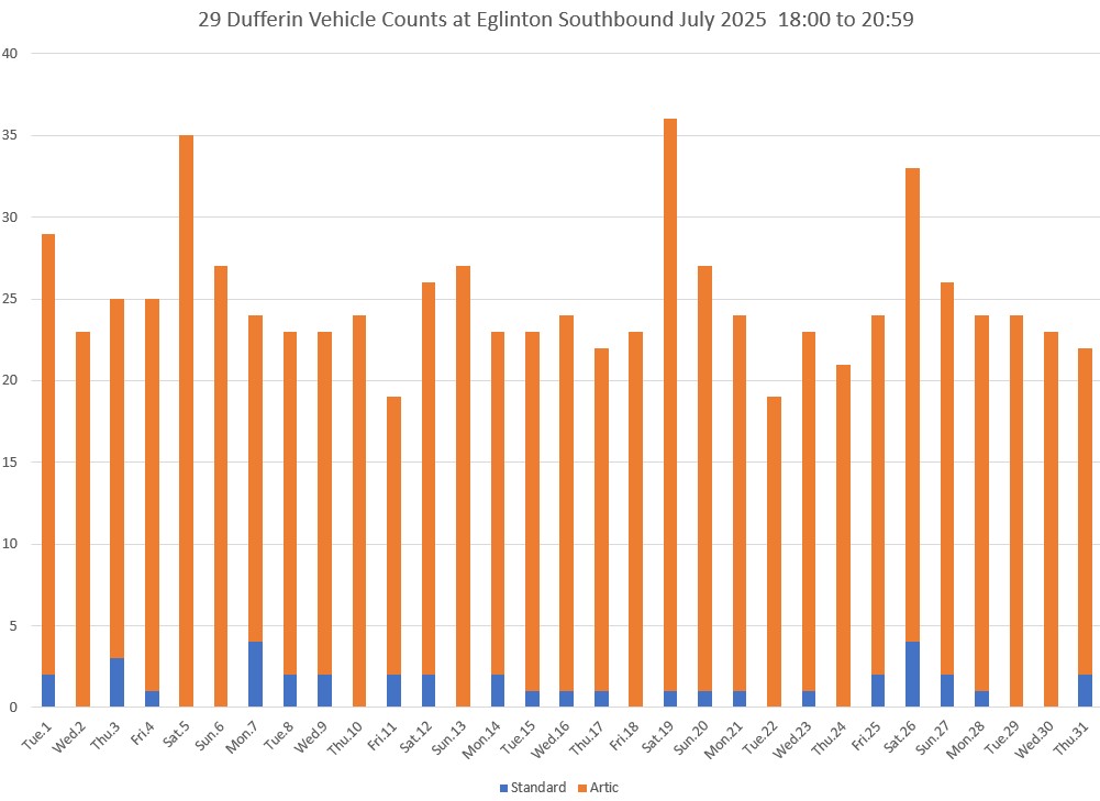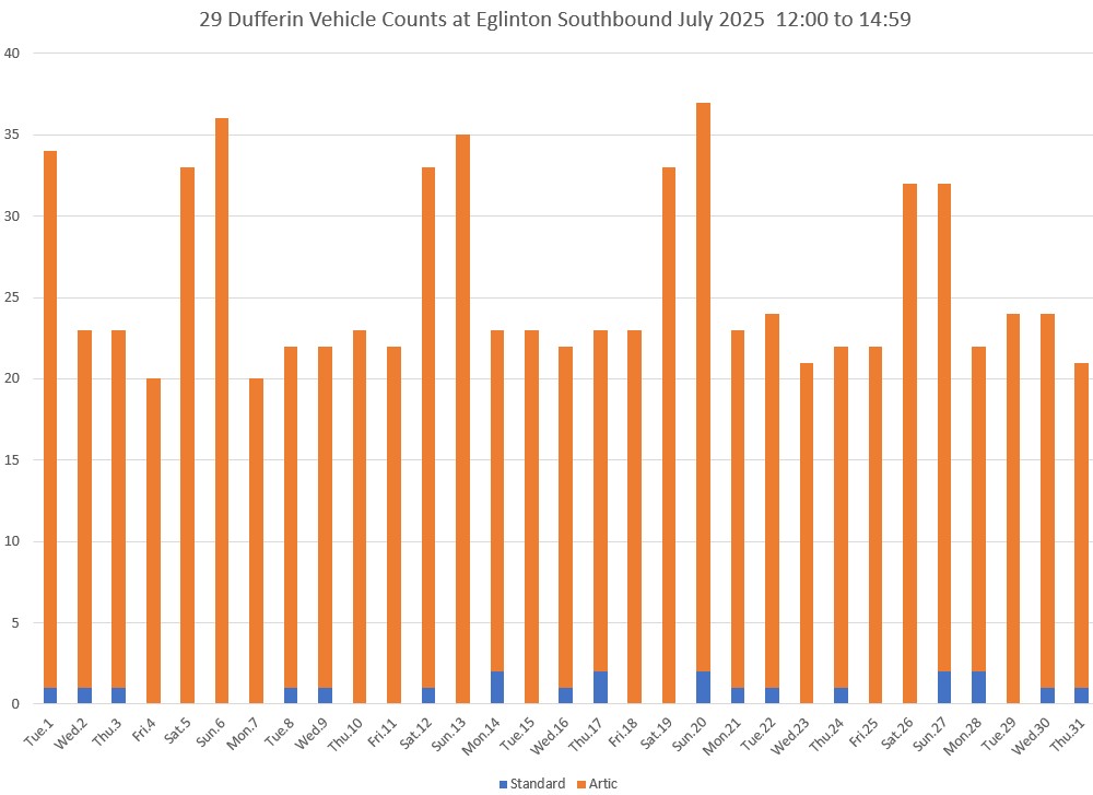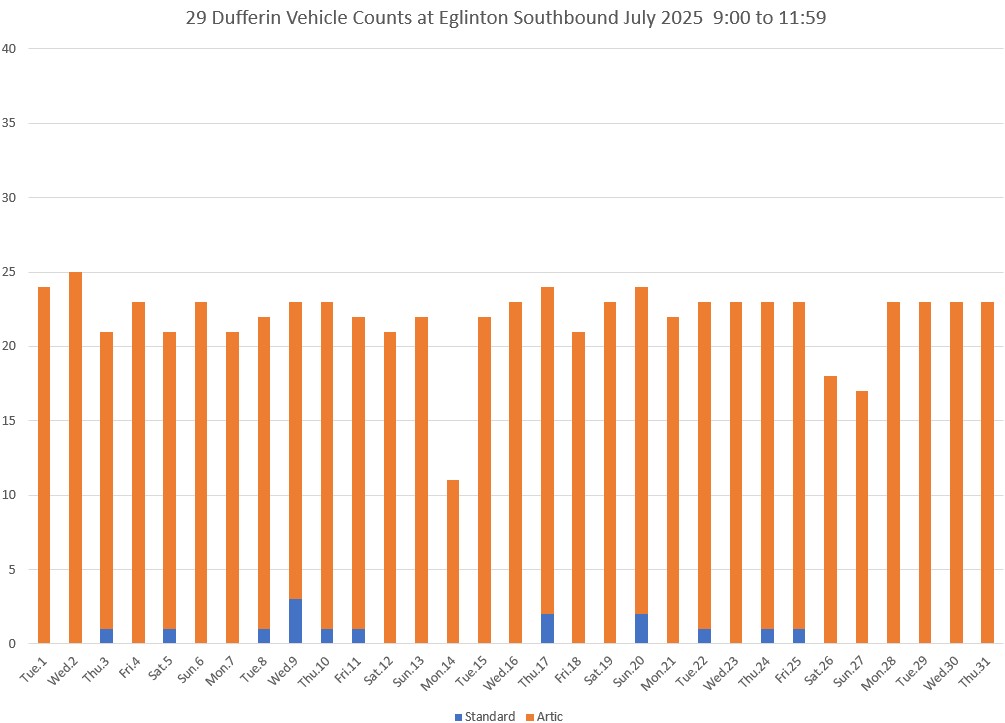 As on other routes, the proportion of 12m buses (blue) operating on Dufferin grows later in the day, but not as dramatically as in some other cases.
