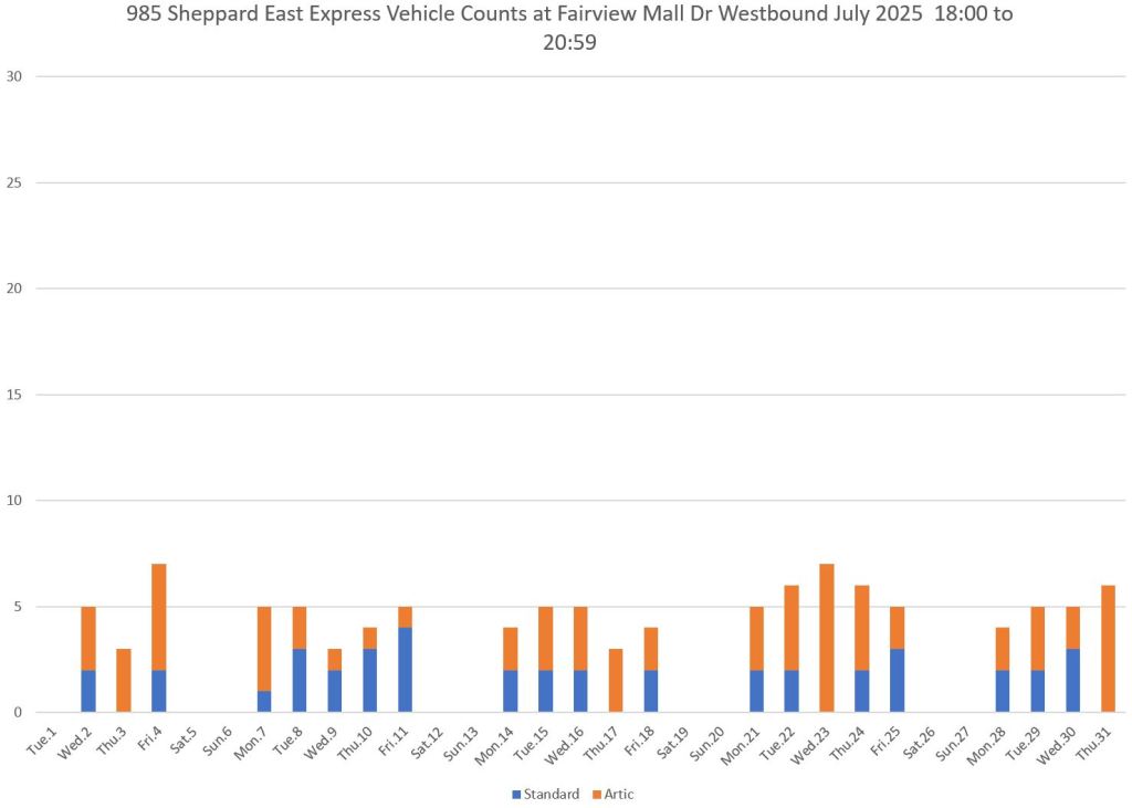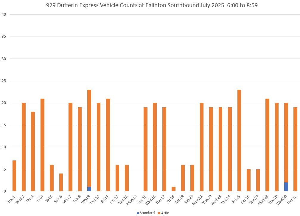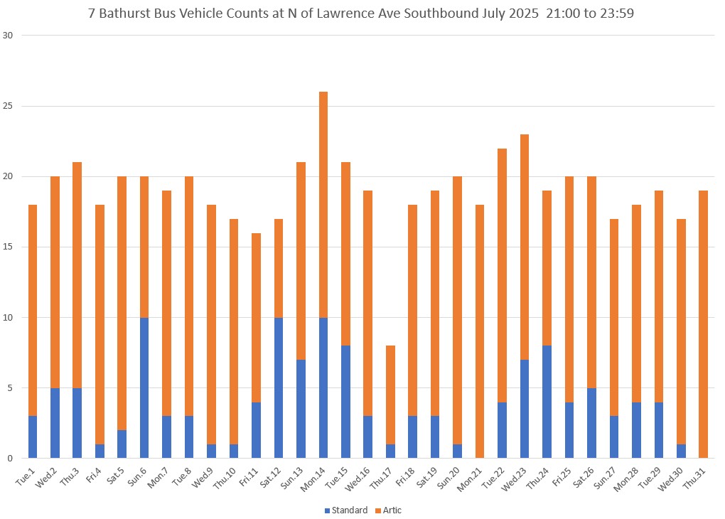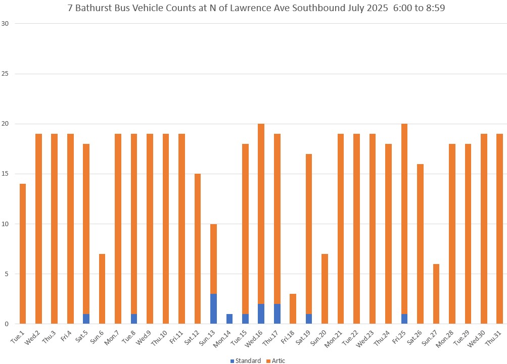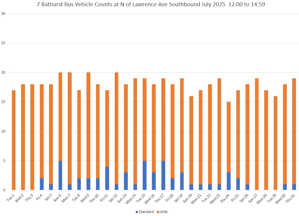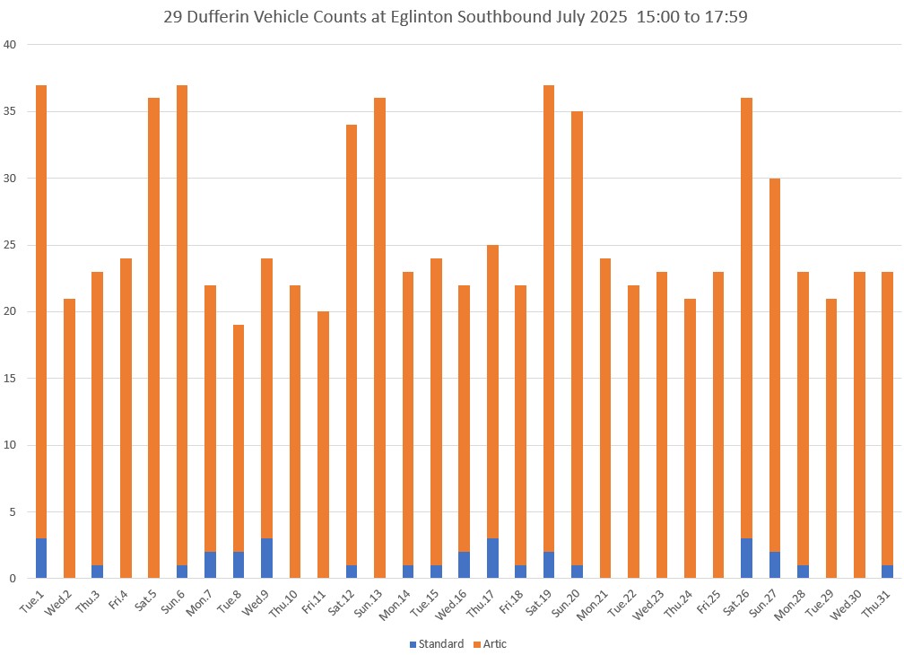 For each day, the actual vehicles from tracking data are counted, and these counts are grouped by three-hour intervals starting at 6am. This broadly gives the AM peak, morning, early afternoon, PM peak, early and late evening time periods. The actual boundaries between these intervals varies from route to route and location to location, but the values for any of these should be consistent from day to day. Weekends, of course, have their own profiles, but all Saturdays should be the same, as should all Sundays. There was no schedule change in the month of July.