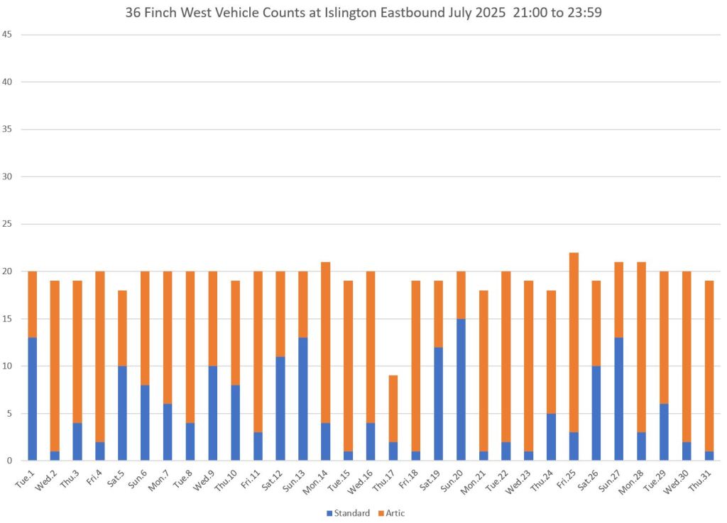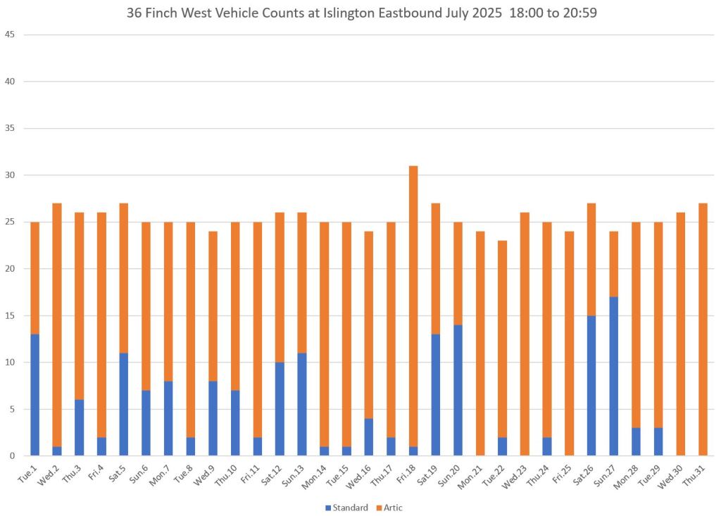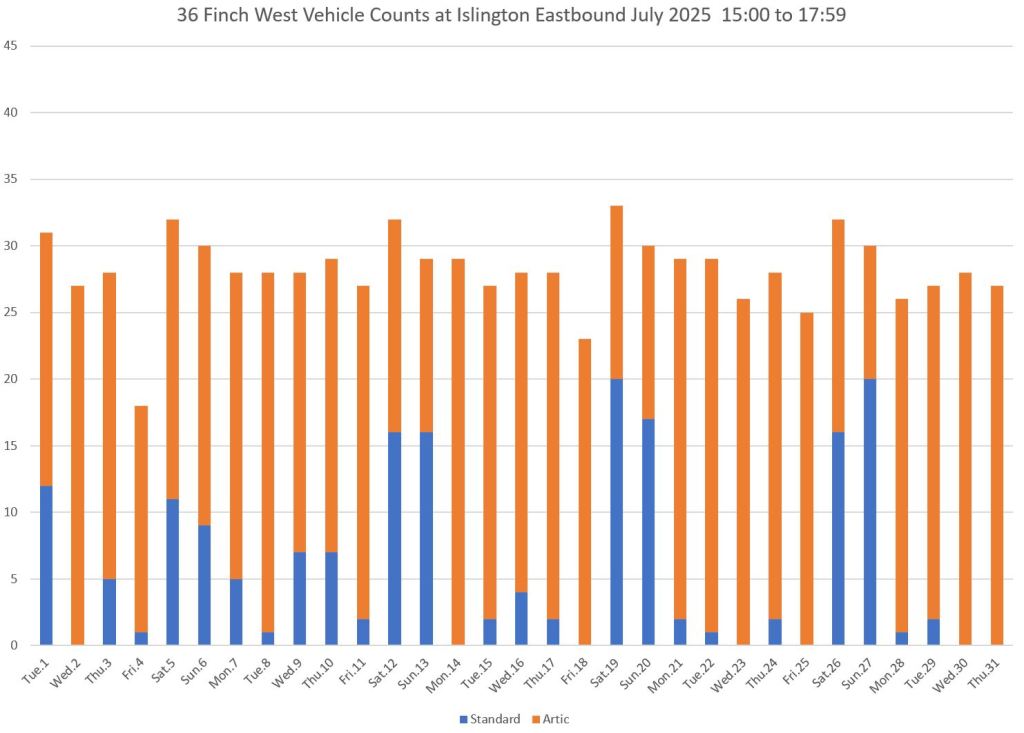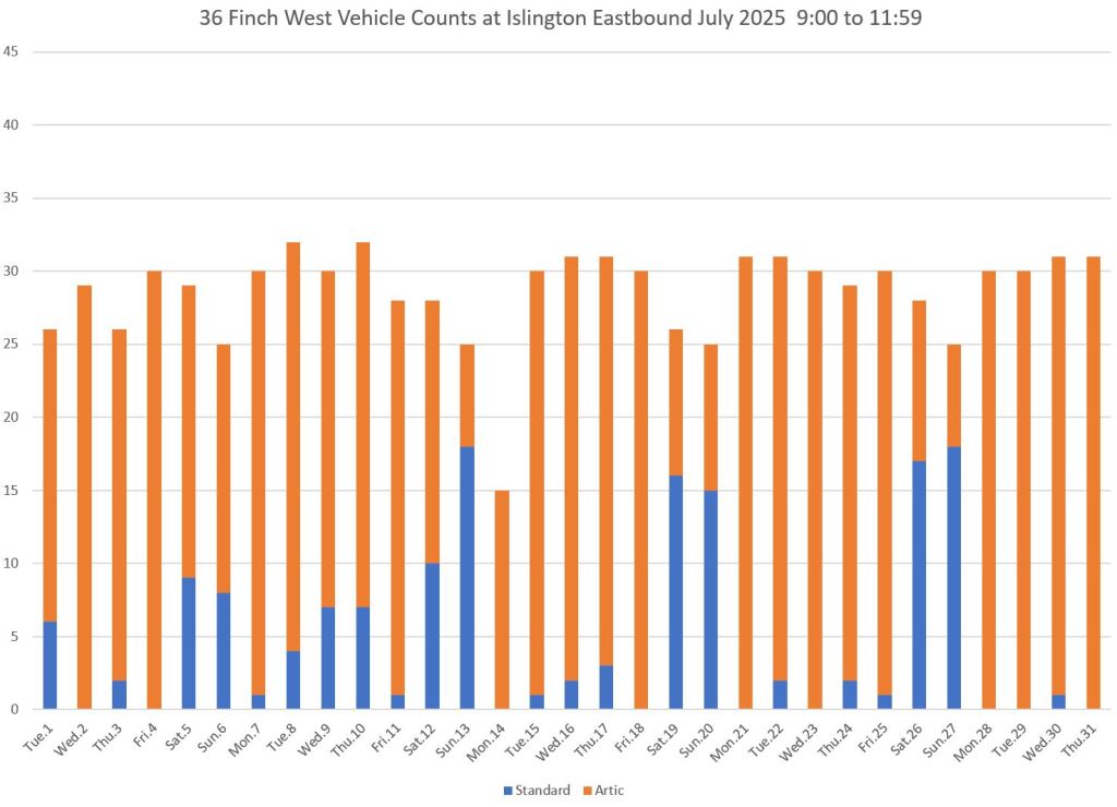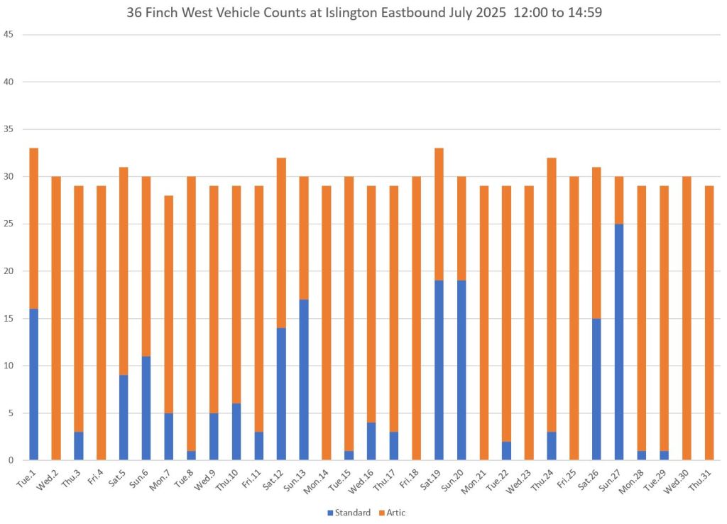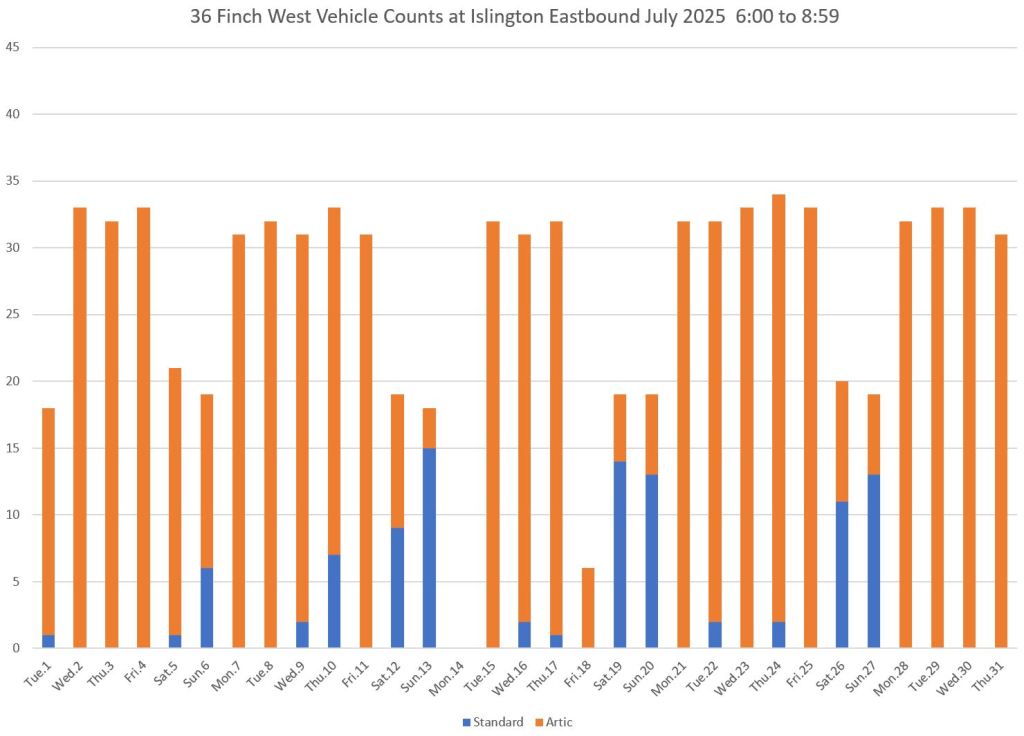 The counts below are taken eastbound at Islington where only the Humberwood service operates and before the Milvan branches merge into the route. The expected number of buses varies over the day because of different levels of scheduled service. Many Humberwood trips operate with 12m buses, and the proportion of these grows later in the day.
