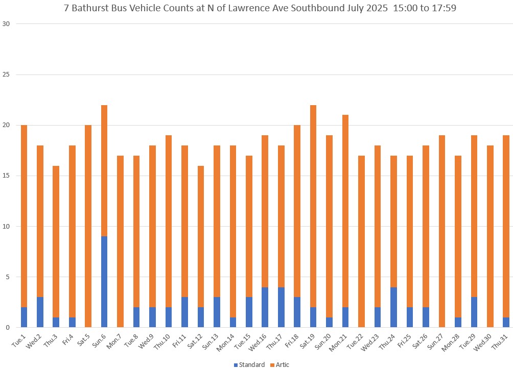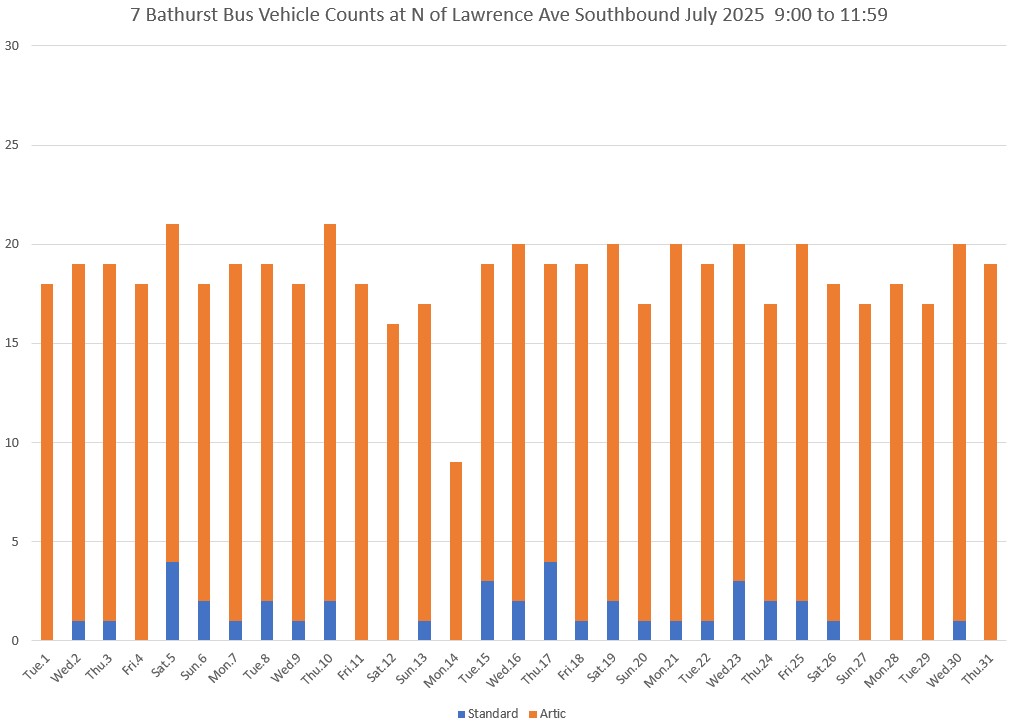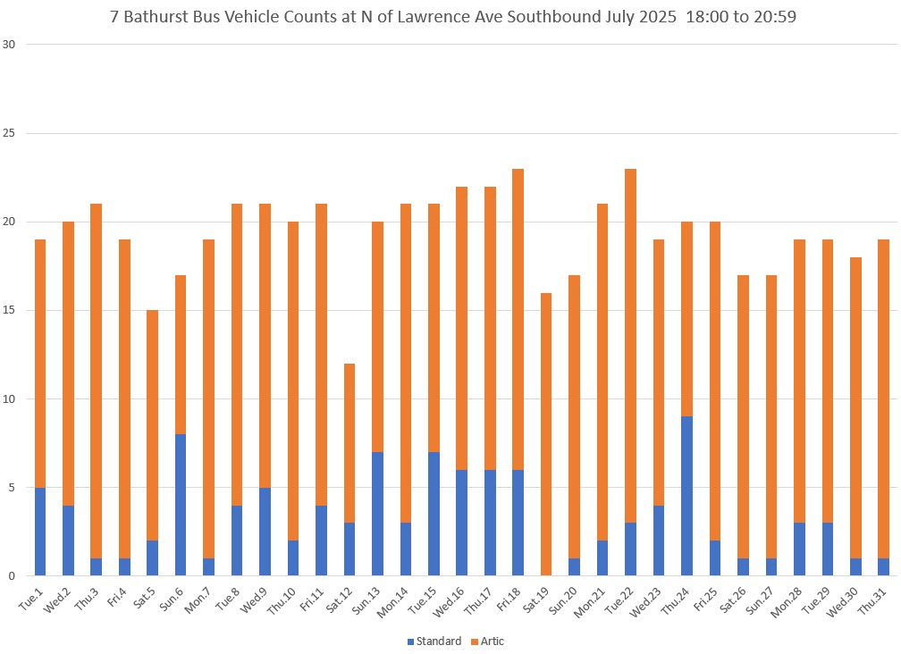 These charts show the daily vehicle counts southbound at Lawrence and Bathurst. The schedule for this route is simple – every 10 minutes all day – and so there should be 18 buses in each three hour period every day.