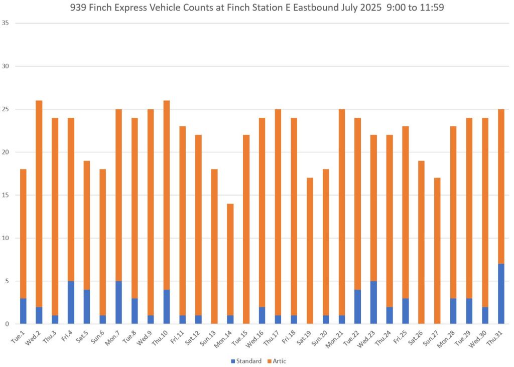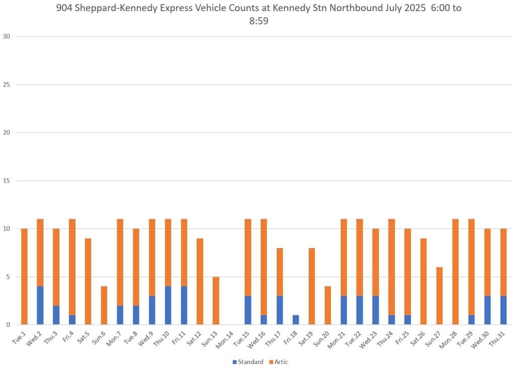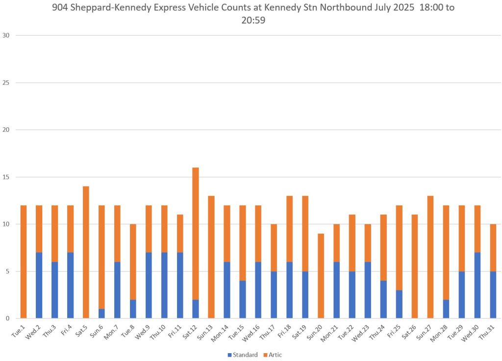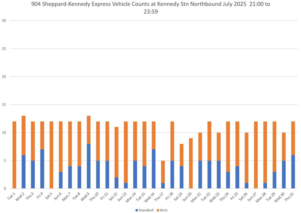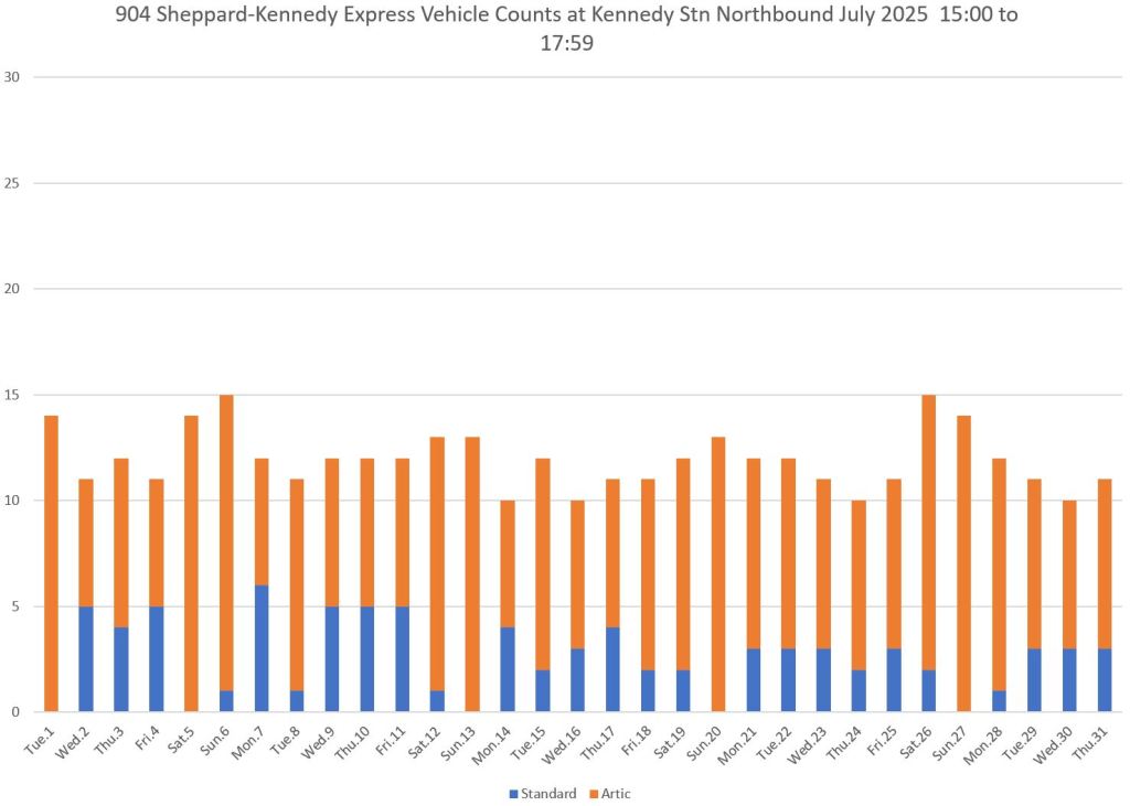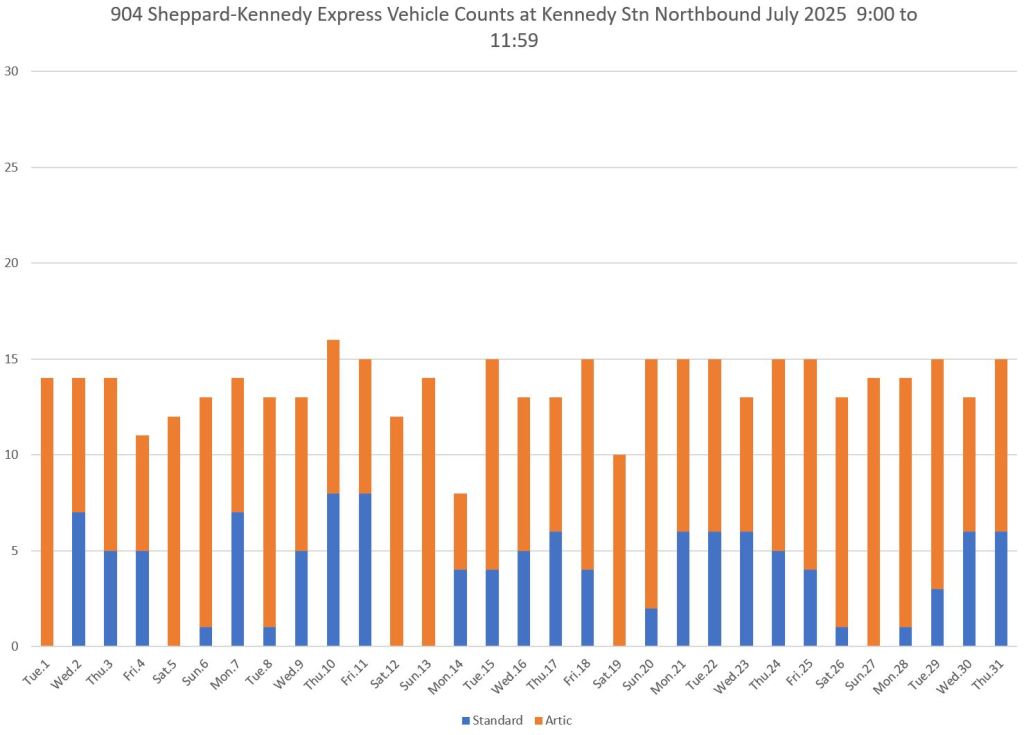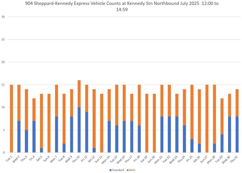 Thank you Steve for keeping track of this. This aligns with my observations. 904/985 always seems to be half and half or mostly standard buses. Often they’ll dispatch a standard for the whole day. If the TTC has issues with the Nova Artics, creating a shortage, they should consider reverting a route or two back to standards to fix the availability issue. I think 905 on weekends and 129B could go back. 941? Maybe this will help?