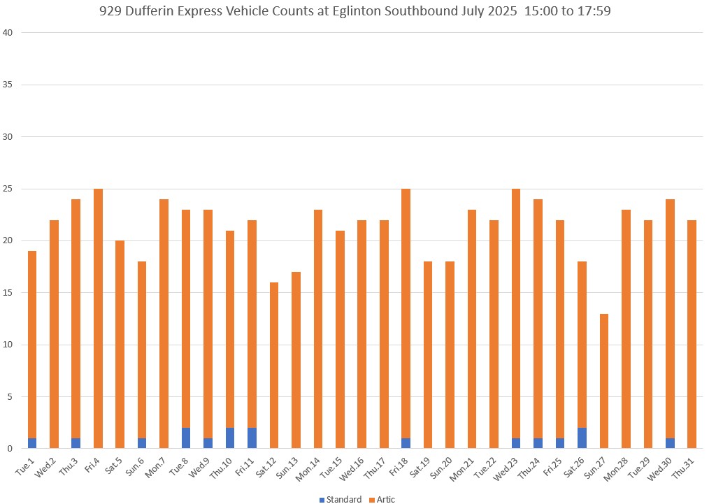 These charts show the counts southbound at Eglinton. During many periods, the local service on Dufferin operates every 8 minutes. Over a three-hour period, one would expect to see 22-23 buses. On weekends, some periods have 5 minute service or 36 buses in a three-hour period.