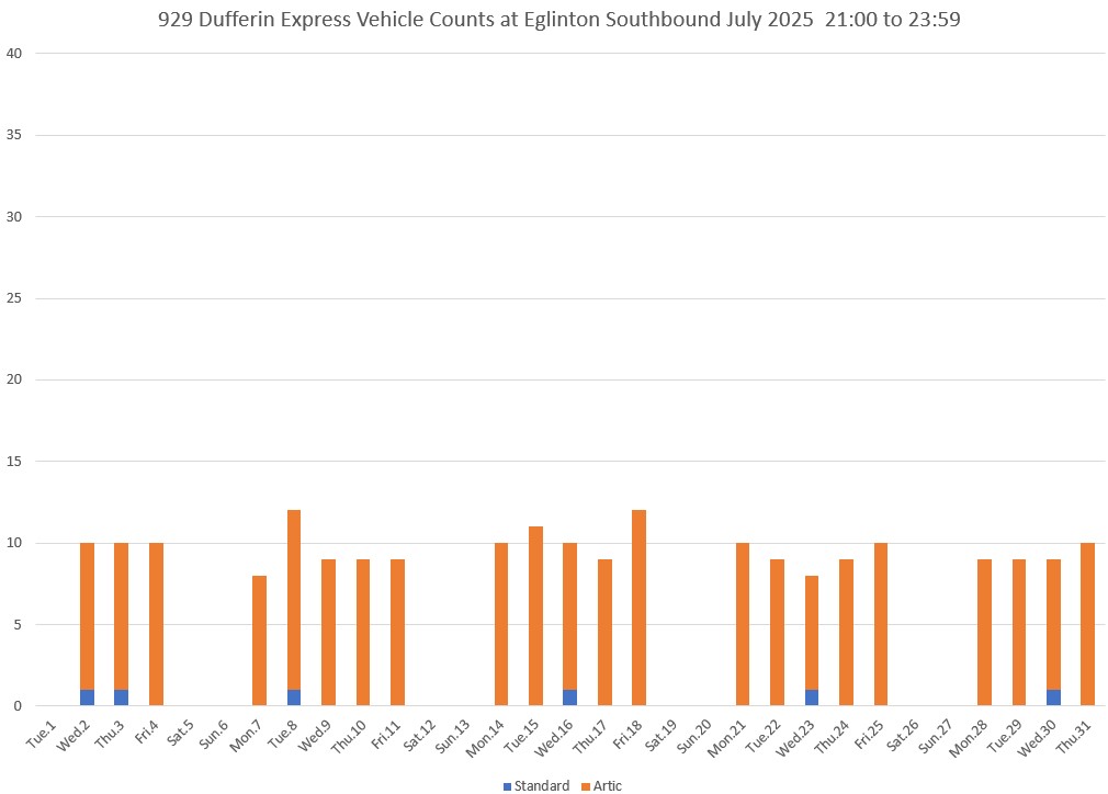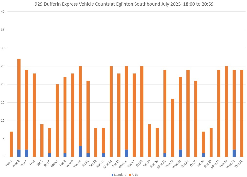 The express service on Dufferin runs every 8 minutes except on weekend afternoons when it drops to every 10. This translates to 22-23 buses in a three hour period most of the time, with 18 buses weekend afternoons. The express service does not run in the late evening and so there are fewer buses in the 9pm chart below.