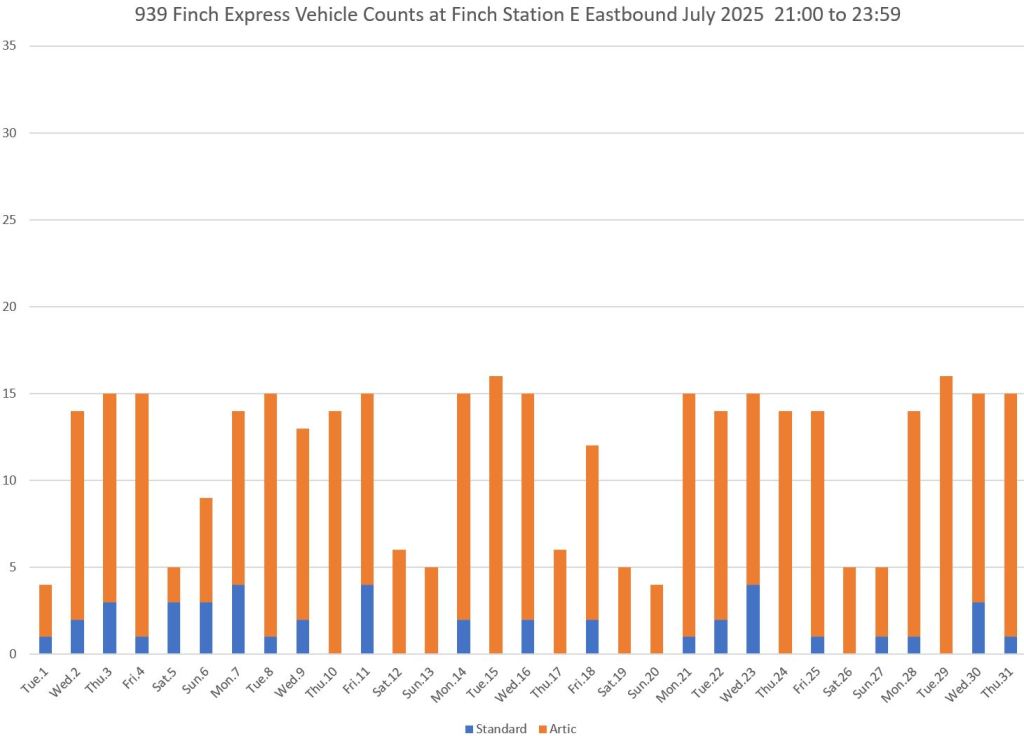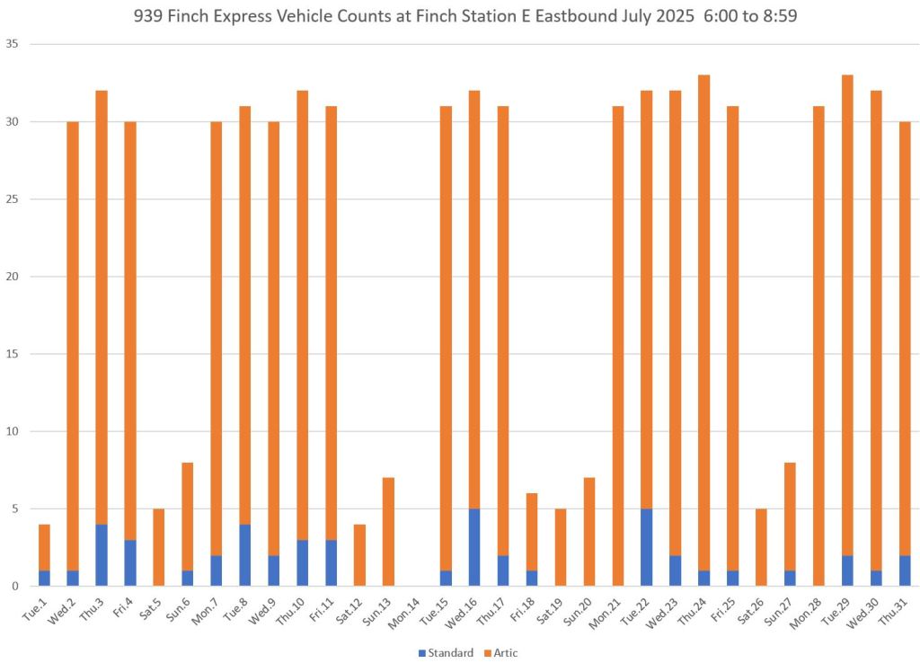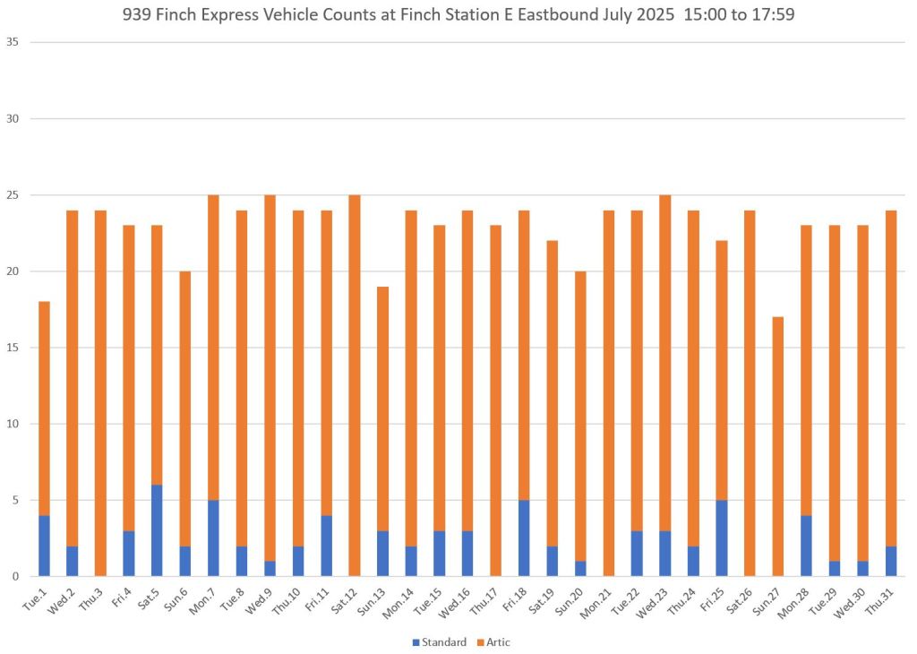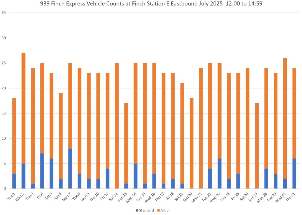 The charts here show the combined service eastbound east of Finch Station. The counts are highest in the AM peak when a 5′ headway operates (12 buses/hour). This drops back to 7’30” weekday midday and PM peak (8 buses/hour), and to 10′ (6 buses/hour) and 15′ (4 buses/hour) in the early and late evening periods.
