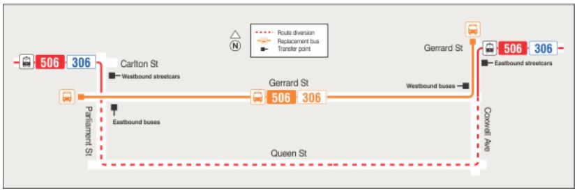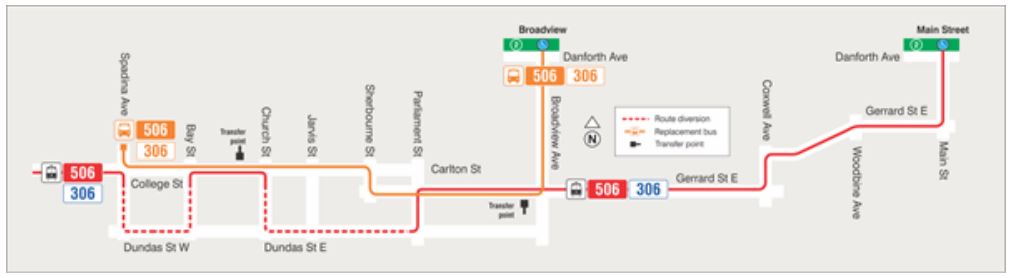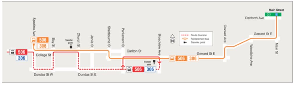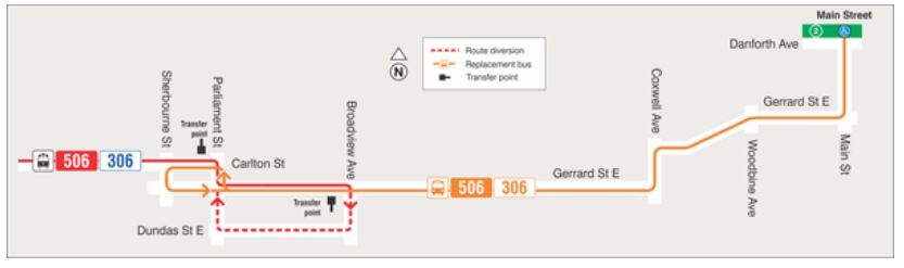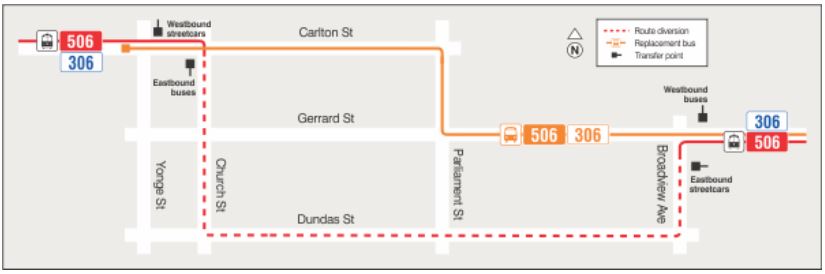 August 18-29: 506/306 Carlton service is diverting both ways via Church/Dundas/Broadview for infrastructure work. Replacement bus from Yonge to Coxwell.