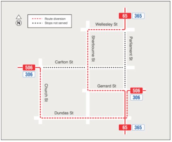 The work at Parliament & Carlton will also require the 65 Parliament bus to divert southbound via Carlton, Sherbourne and Gerrard.