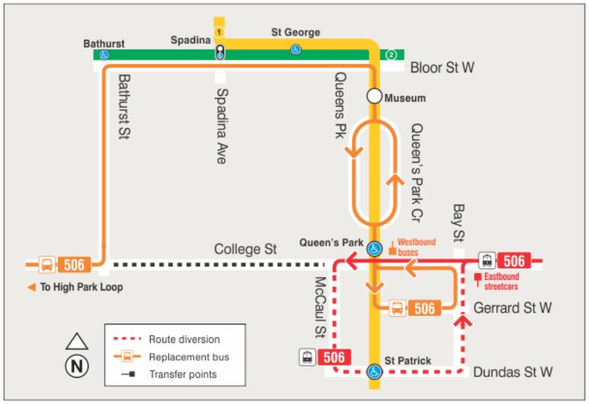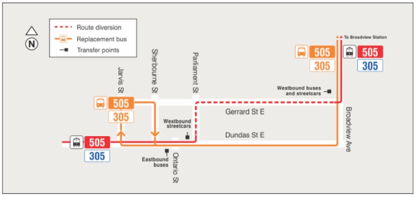 • November 17 11pm to Nov. 18 10am: Service diverts via Church/Dundas/Parliament for track and overhead work at Carlton & Parliament.