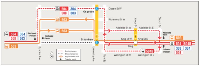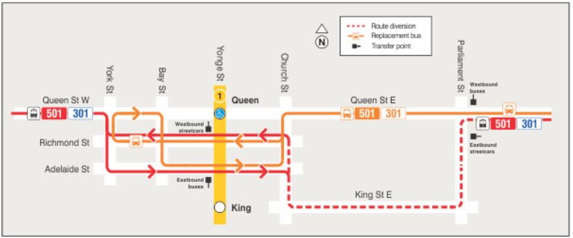 • Ongoing: Ontario Line diversion westbound via Church/Richmond/York and eastbound via York/Adelaide/Church.