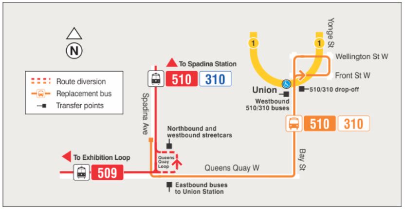 • September 19 11pm to September 22 4am : Streetcar service will run from Spadina Station to Queens Quay Loop with a shuttle bus to Union Station during infrastructure work. (See map below.)