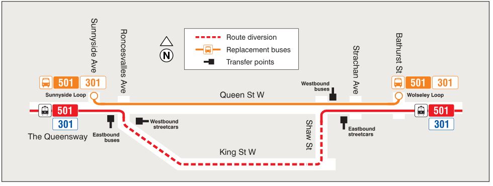 • During phase one, buses will operate via Queen and Parliament both ways to serve stops missed by the 501 Queen diversion. The diversion began on November 16.