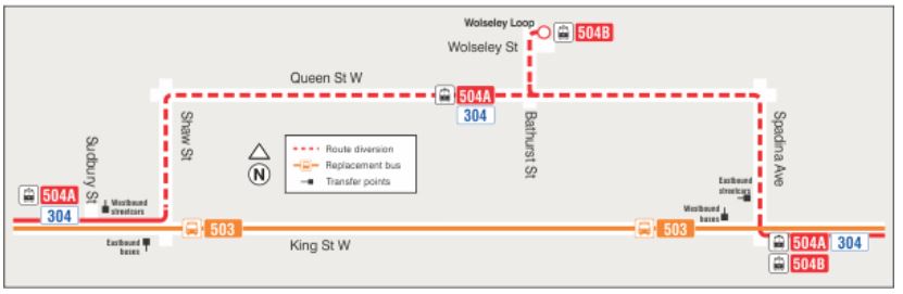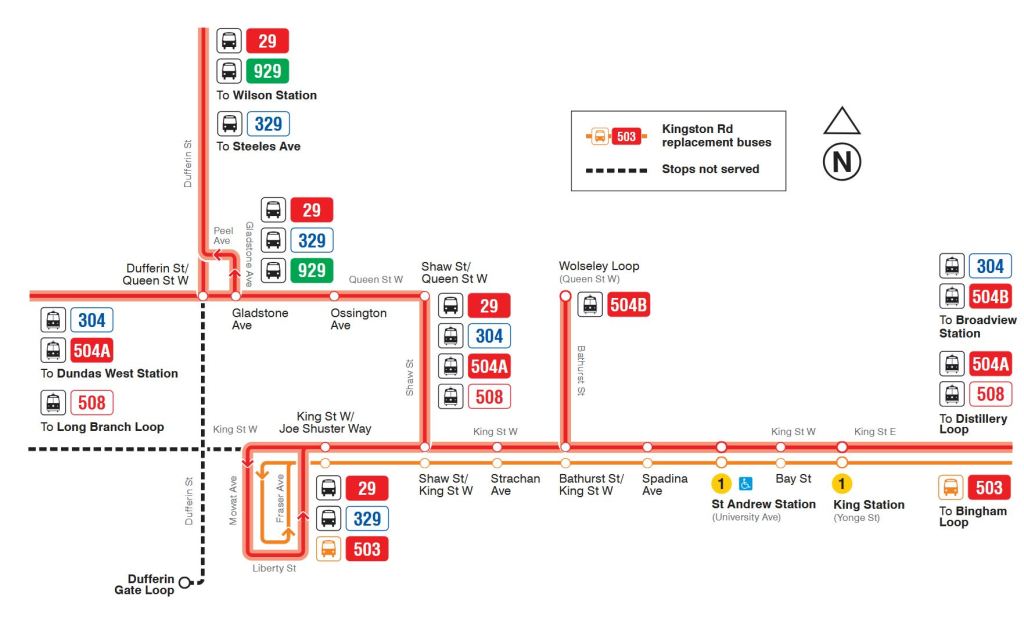 • 304 King and 329 Dufferin confirmed to be diverted on the same routes as the 504A and 29 daytime services.
