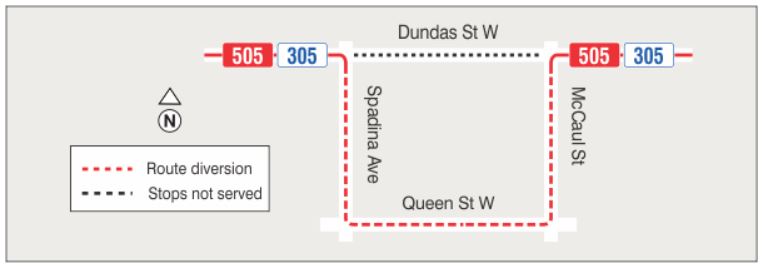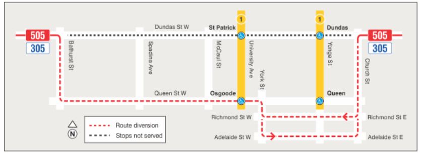 • October 5, 7am to 1pm: Dundas 305/505 service will divert between Bathurst and Church via Queen (including the Richmond/Adelaide diversion) for the Run for the Cure. There will be no service on Dundas Street.