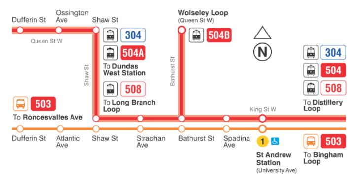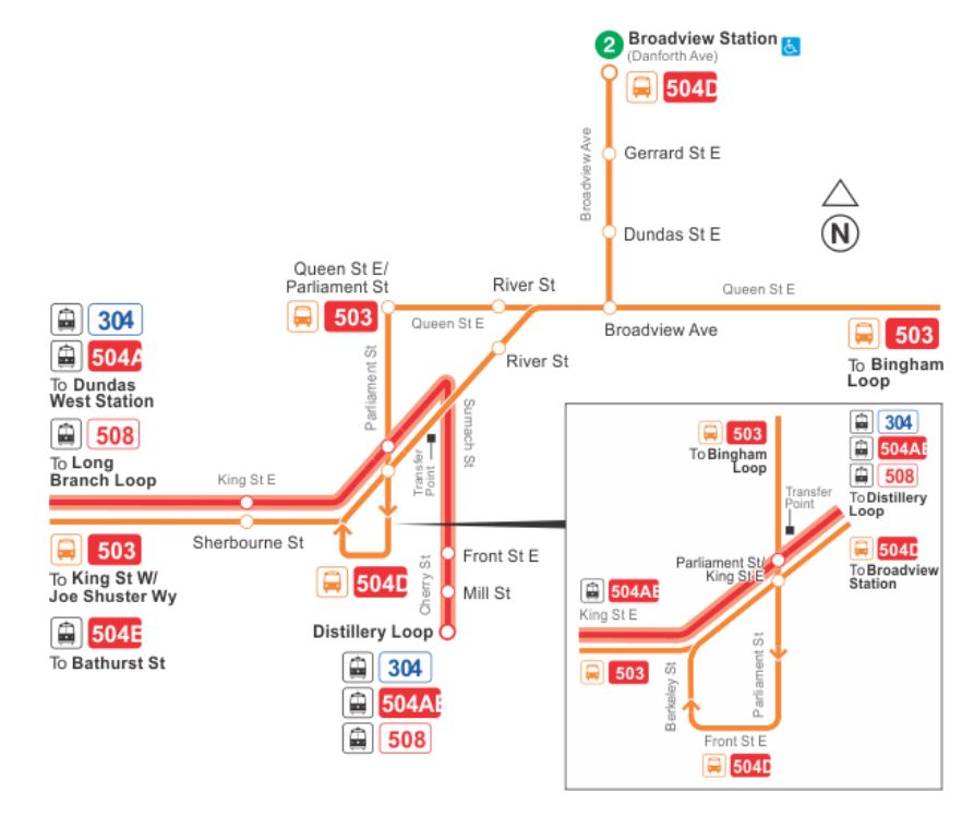 • As of mid-August: 504 King streetcars operate between Broadview and Dundas West Stations diverting via Queen between the Don Bridge and Shaw Street, including the Ontario Line diversion downtown. 504C King buses operate from Bathurst Street to the Distillery District, and 504D King buses operate from Bathurst Street to Broadview & Gerrard.