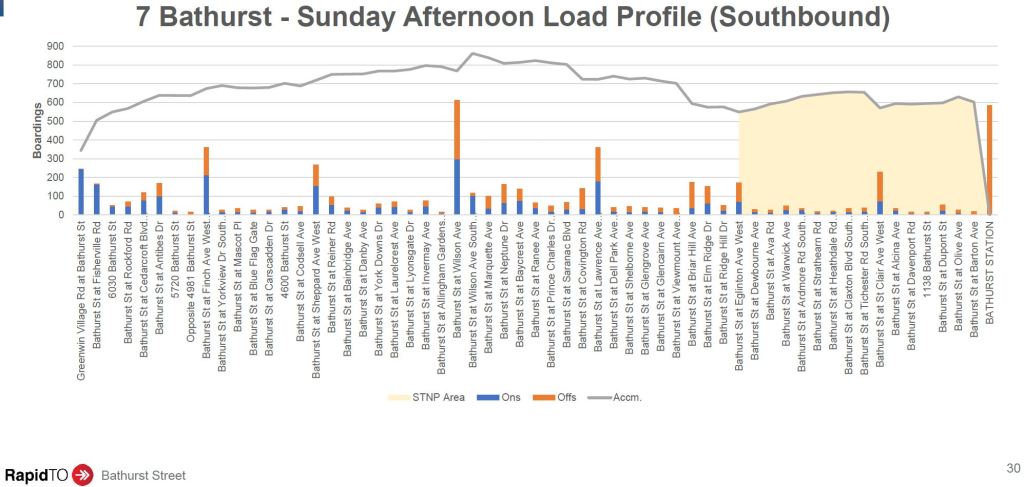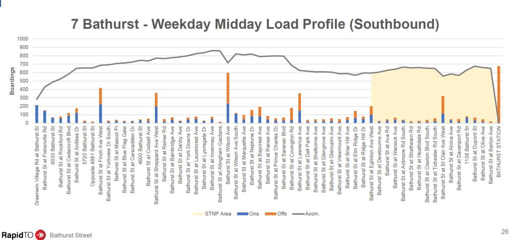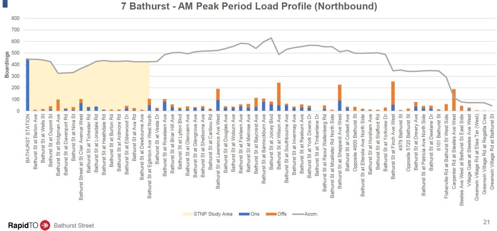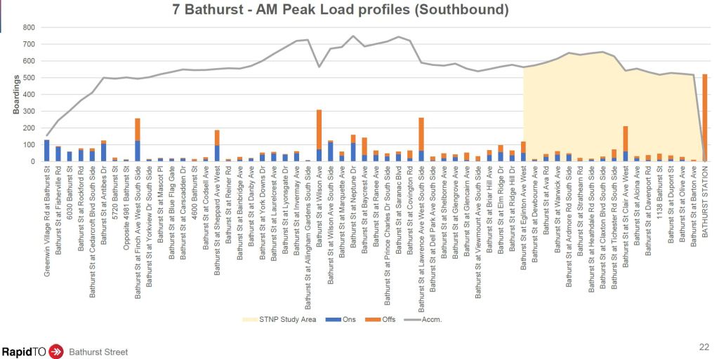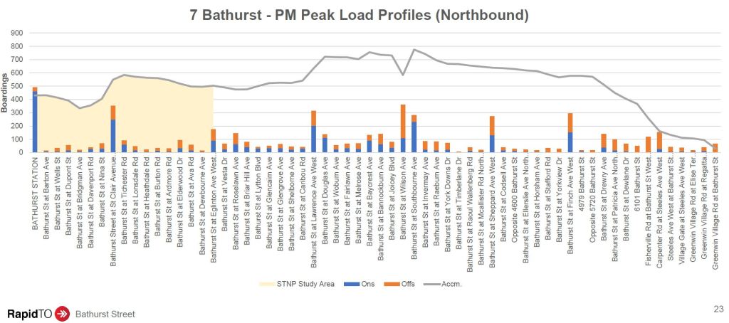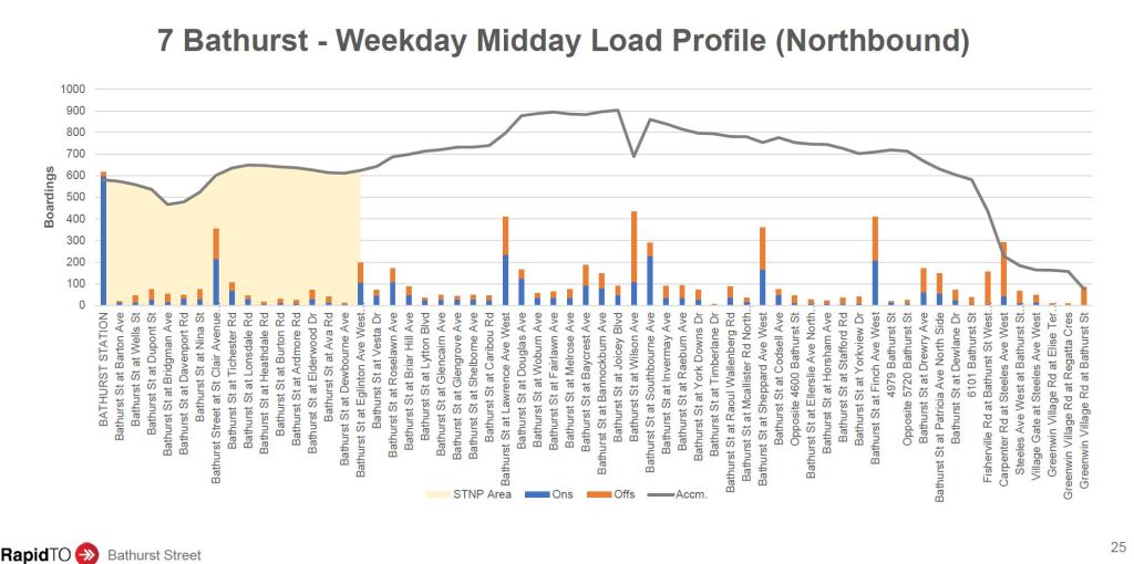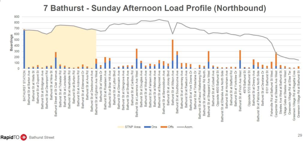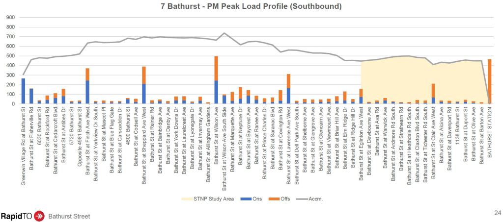 7 Bathurst is a route with many transfer points, and the loads do not accumulate from the one terminal to another. For example, southbound in the AM peak, there are many who alight at Finch, Sheppard, Wilson and Lawrence. The accumulated load is actually higher north of Lawrence than it is at Bathurst Station.