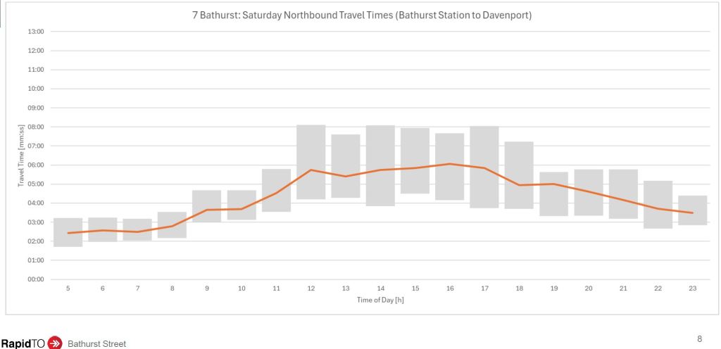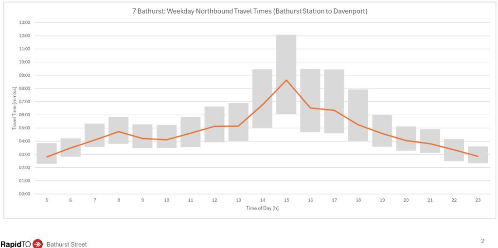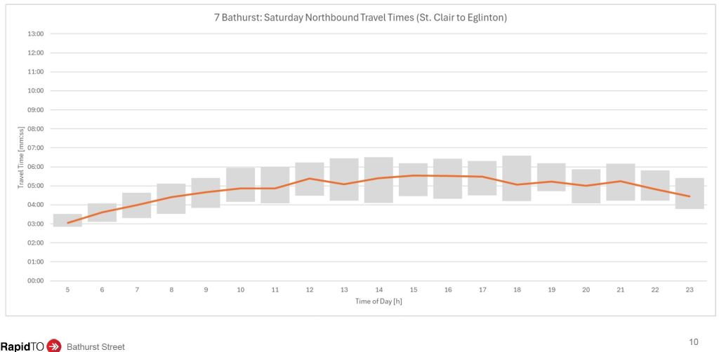 Travel times and the range of values are shown for three segments between Bathurst Station and Eglinton below.