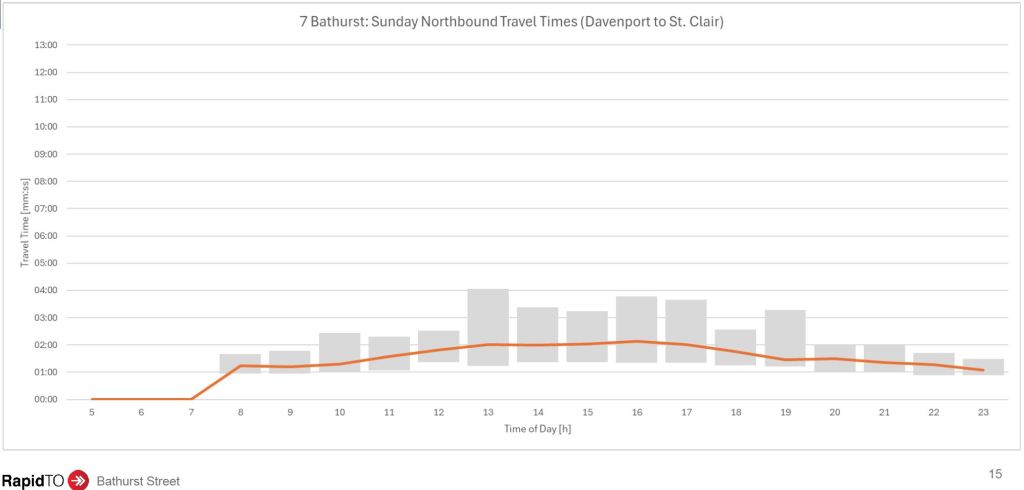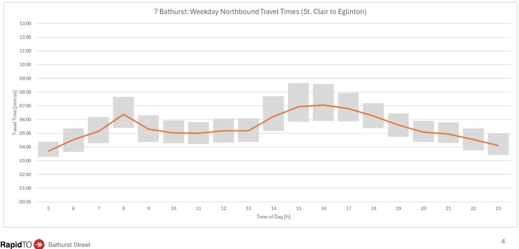 The service on 7 Bathurst is 6 articulated buses/hour all day, every day. Based on the Service Standards, this corresponds to a design load of 462/hour peak (6 x 77) and 276/hour off peak (6 x 46). The number of hours covered by each interval is not shown, and therefore we cannot translate the values to riders/hour nor compare them to the Standards.
