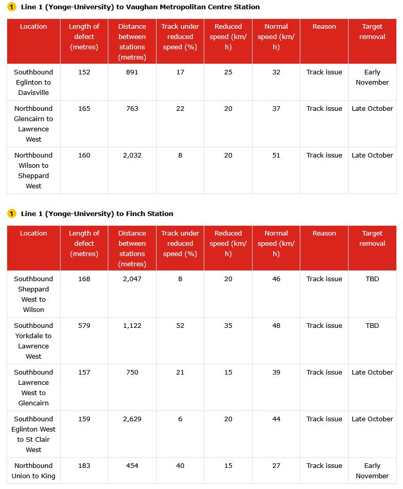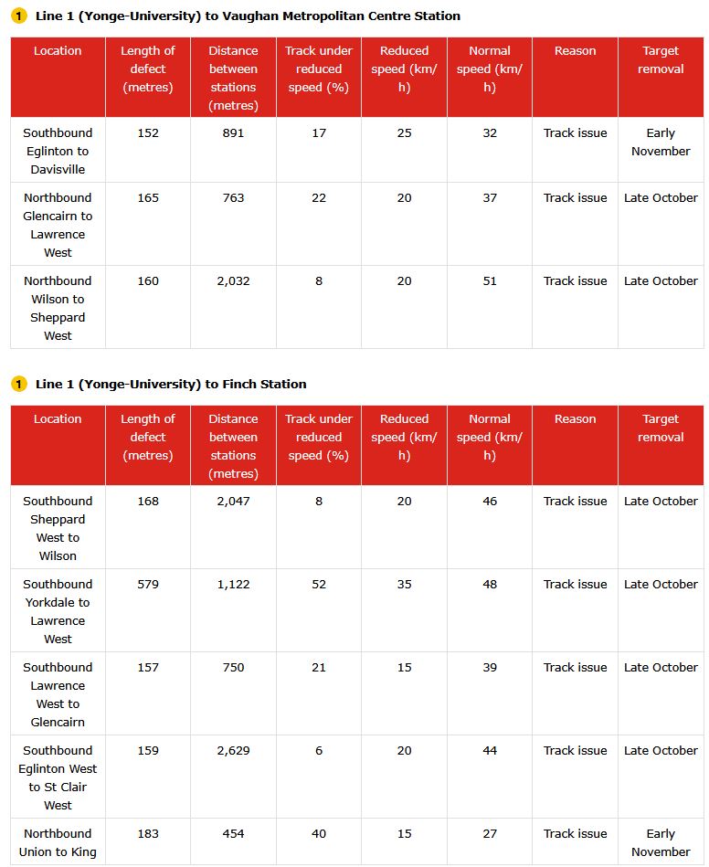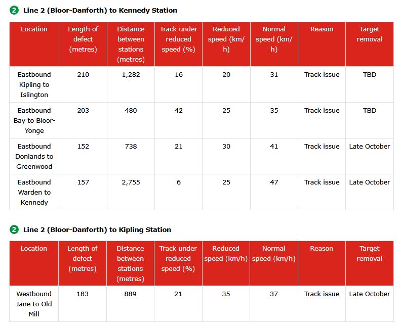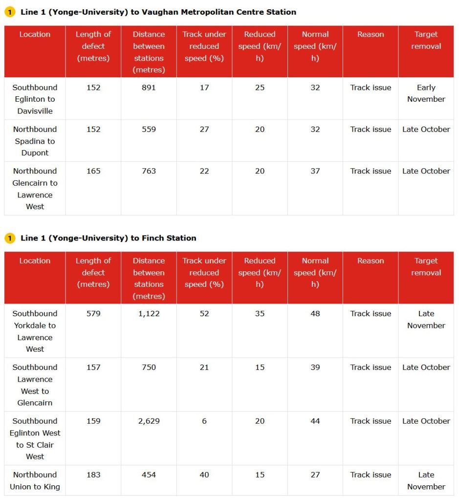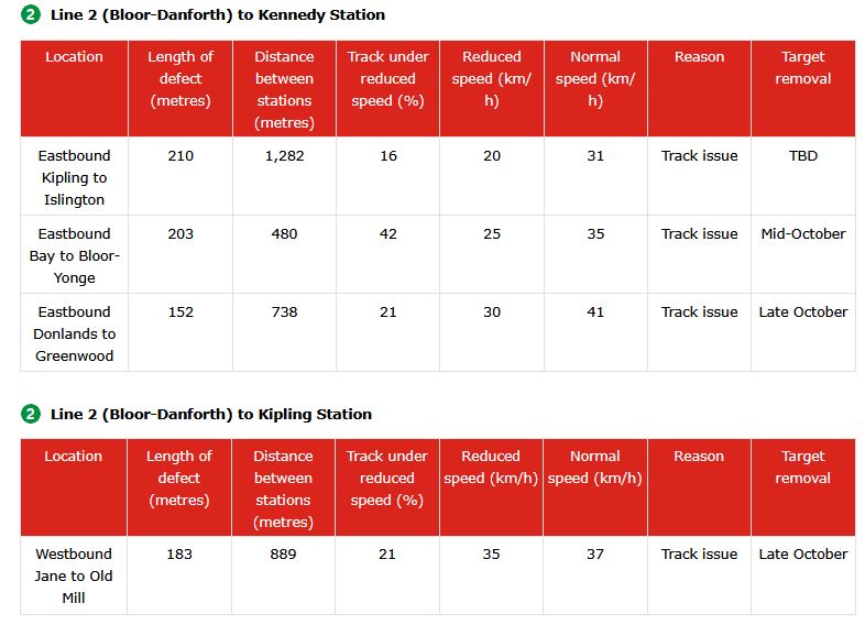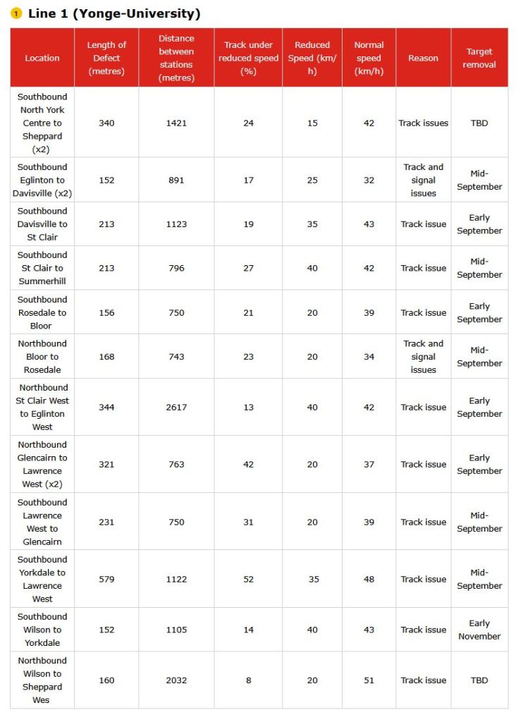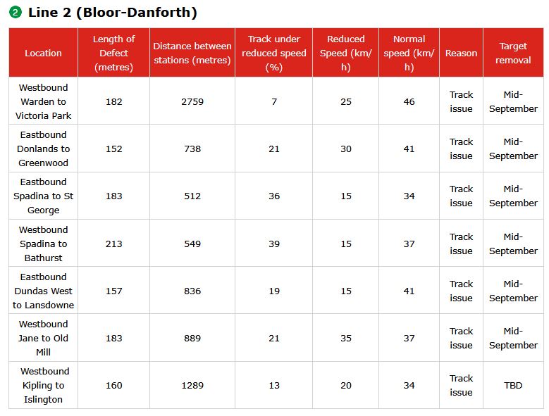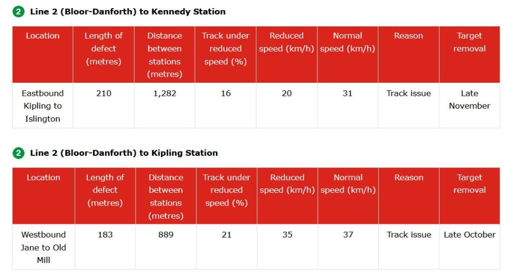 The TTC needs to adopt a consistent way of reporting reduced speed zones, counting how many are active and projecting credible target dates for remediation. As thing now stand, the information in the maps and text differs, and the count of RSZs appears to be lower than what is actually in effect. In turn, this allows management to “hit” a lower target by under-reporting problems, and this is precisely the sort of behaviour that has bedevilled the TTC’s performance metrics for years.