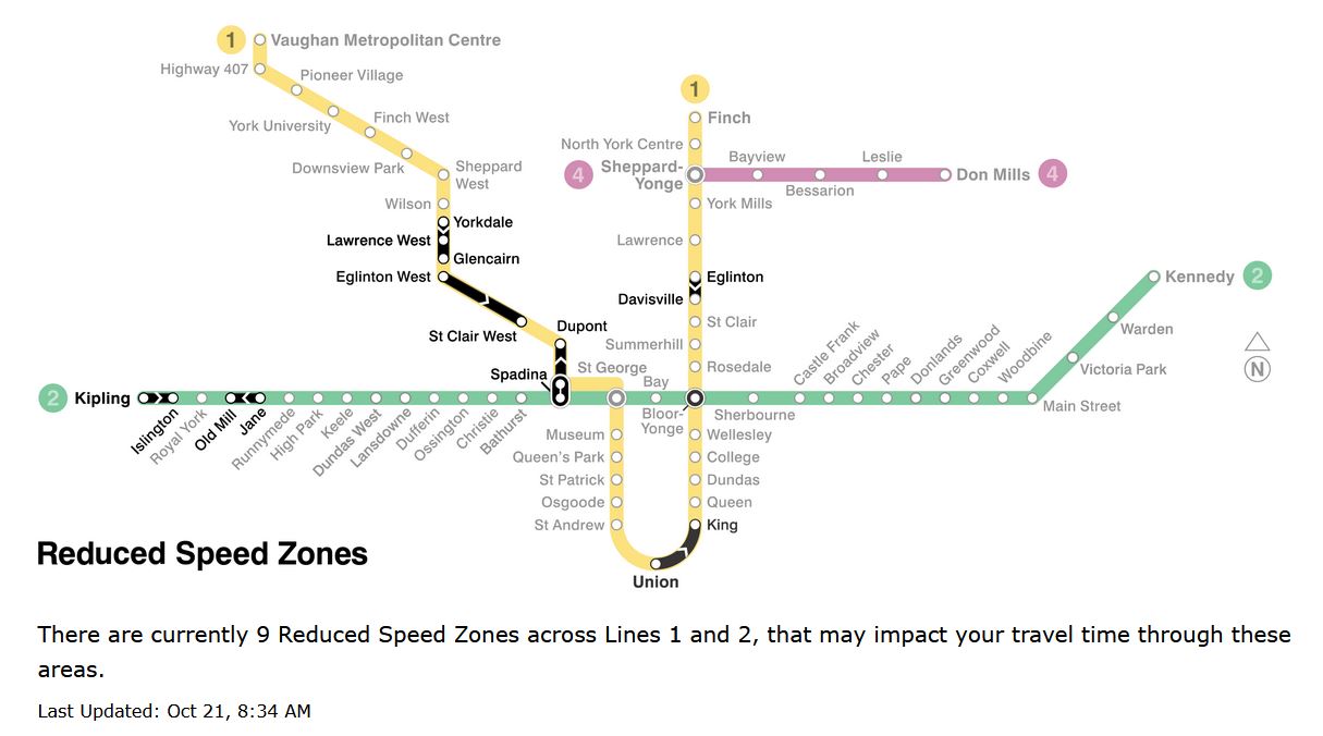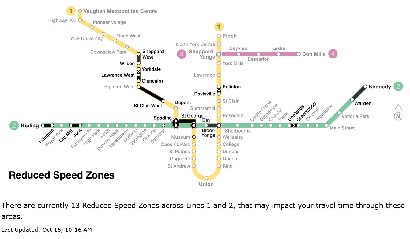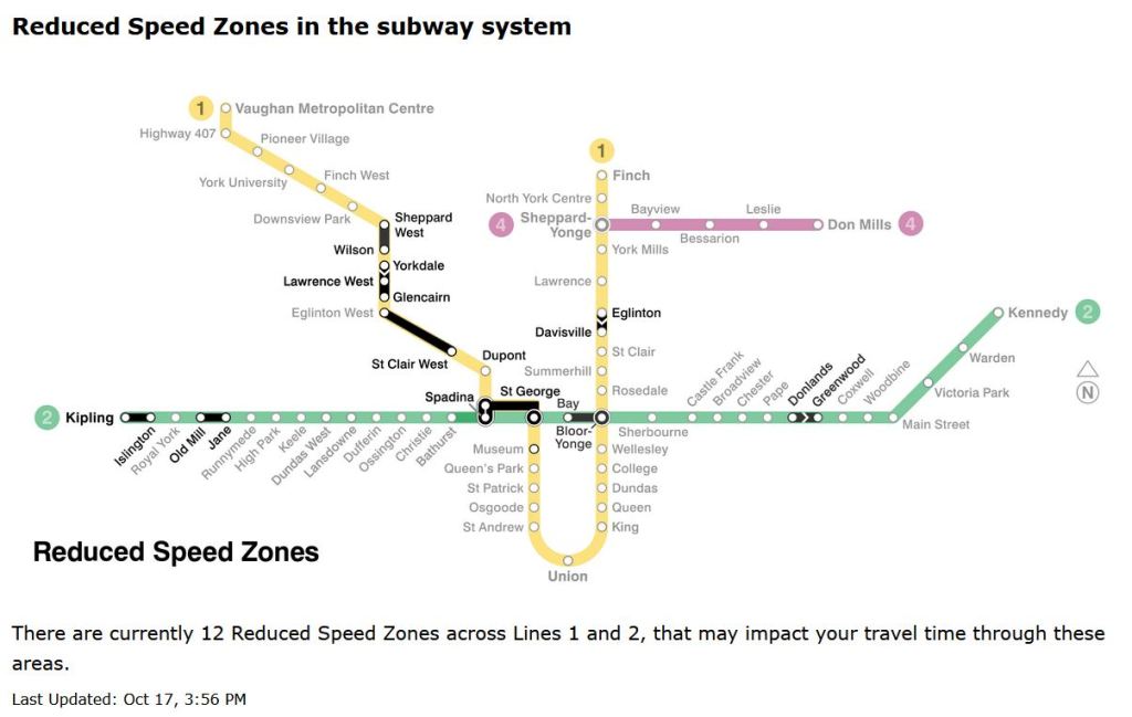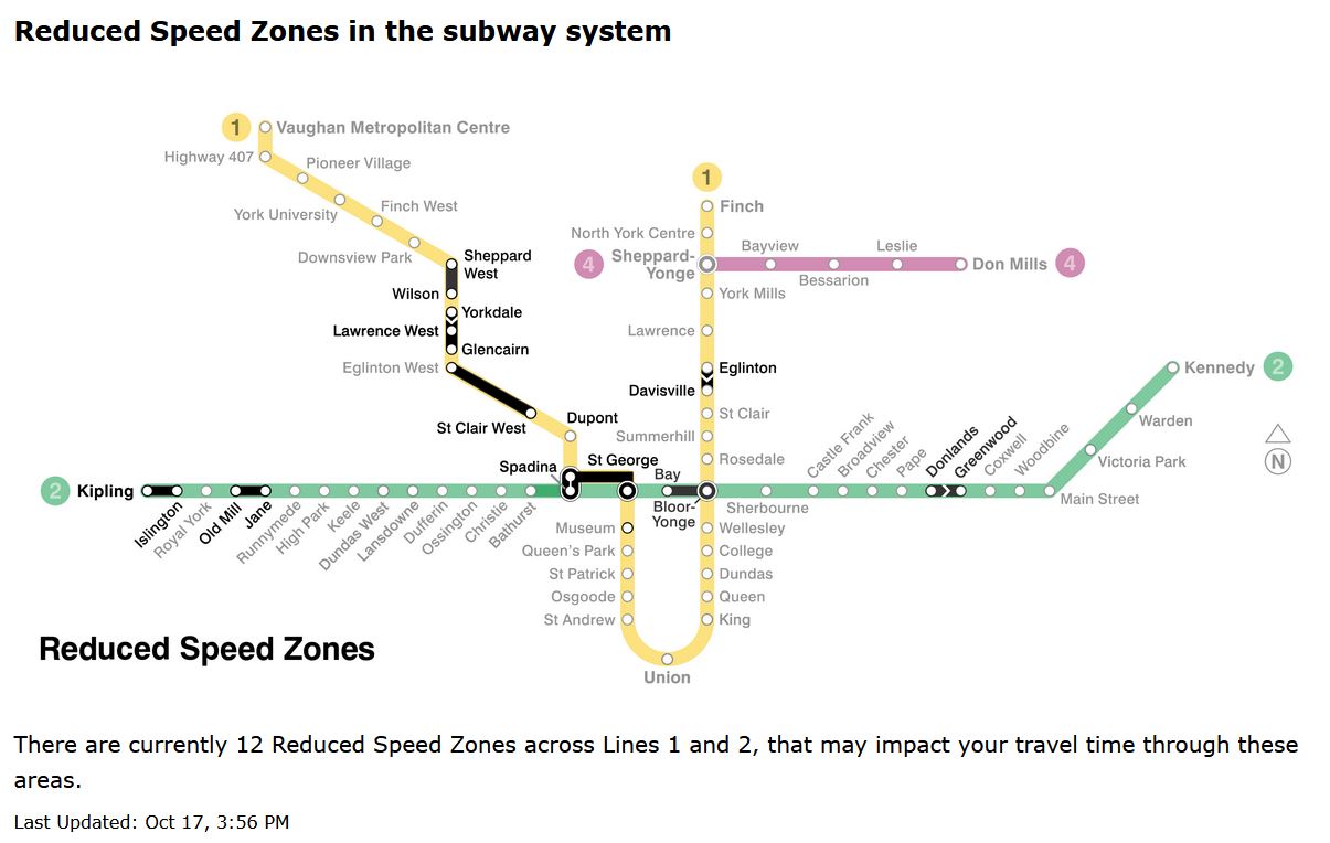 Updated October 17 at 11:00pm: The TTC posted an updated map and table of Reduced Speed Zones dated October 17, but the info on the map is still out of sync with the info in the table of slow zones. The revised version is at the end of the article.