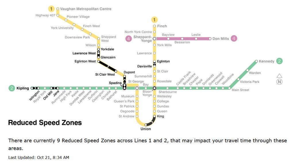 Updated October 21 at 4:20pm: The TTC posted an updated map and table of RSZs dated today. Information on the map and tables now match. There are only 9 active slow zones with target removal dates through to late November. The October 21 versions have been added to the end of this article.