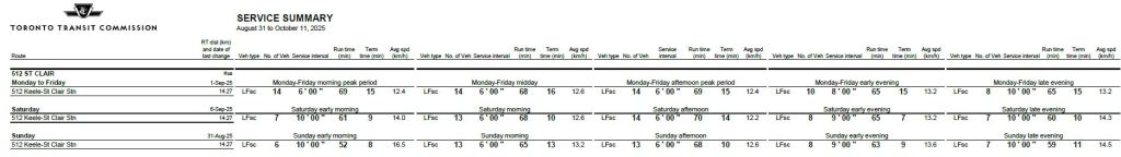 (*) For a period in Oct-Nov 2024, the route was split with streetcars operating from Gunn’s Loop (Keele) to Bathurst Station, and buses from Oakwood Loop to St. Clair Station. This was not shown in the published service summary, but does show up in the observed data for the portion of the route operated with buses.