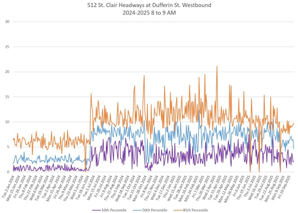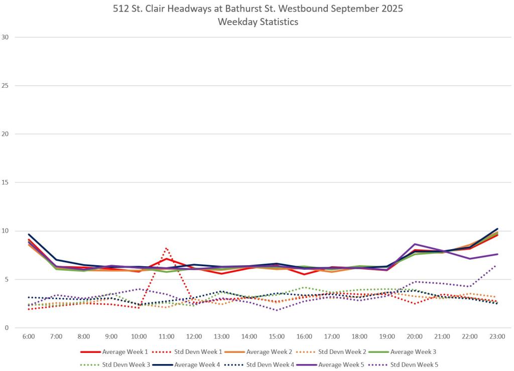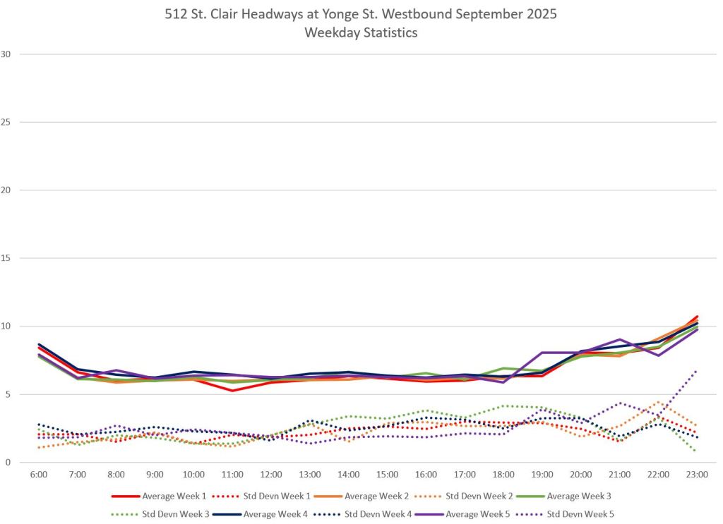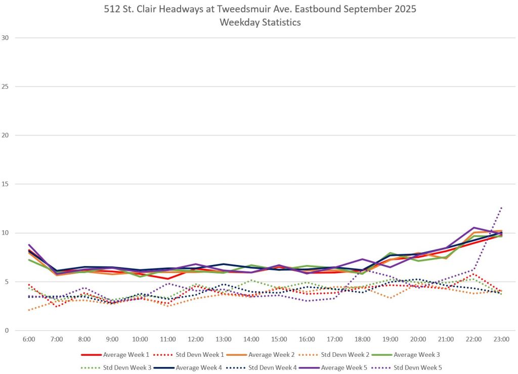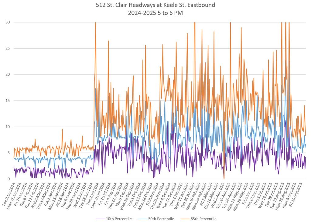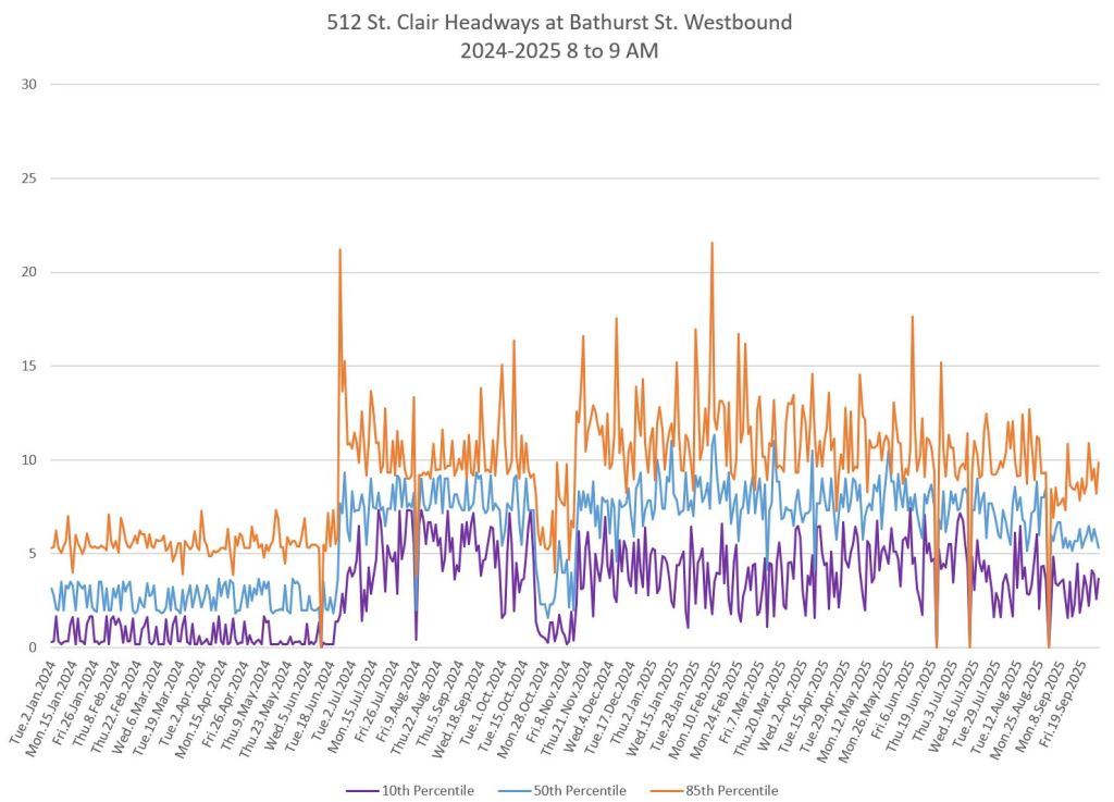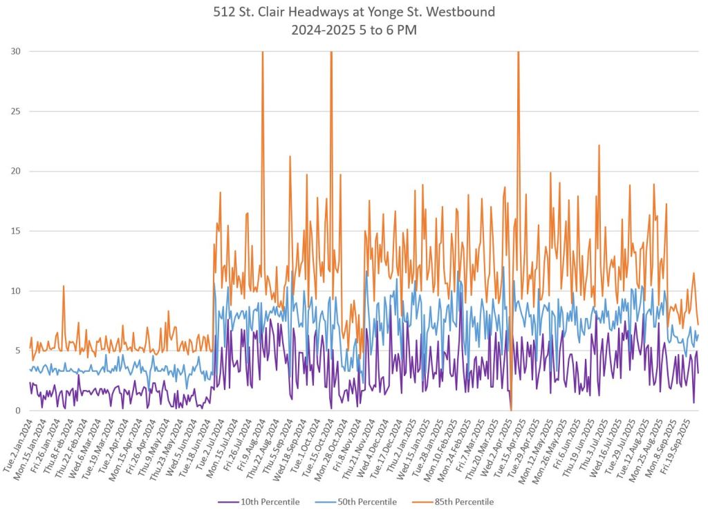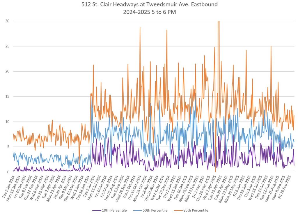 The 512 St. Clair car received improved service in September 2025, and this article updates the charts with headway stats to September 30 showing the combined effect of more service and route management.
