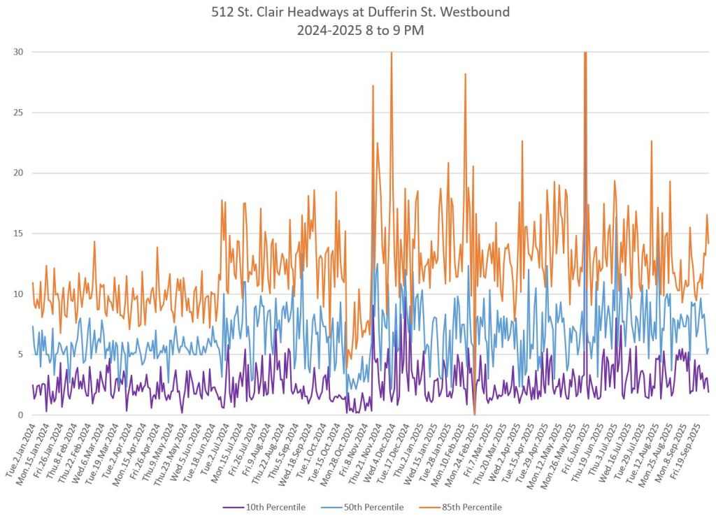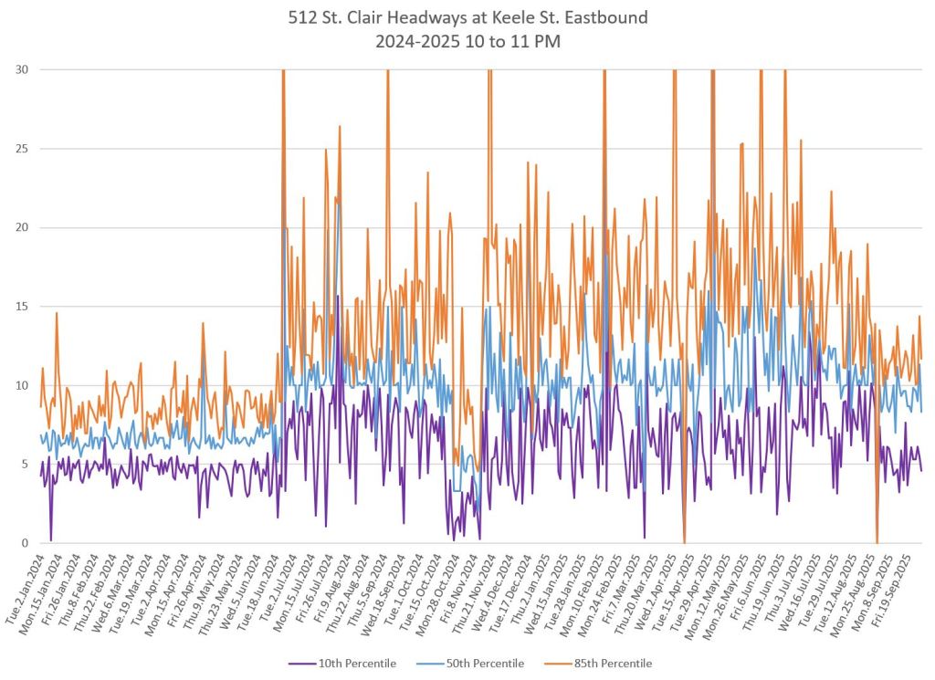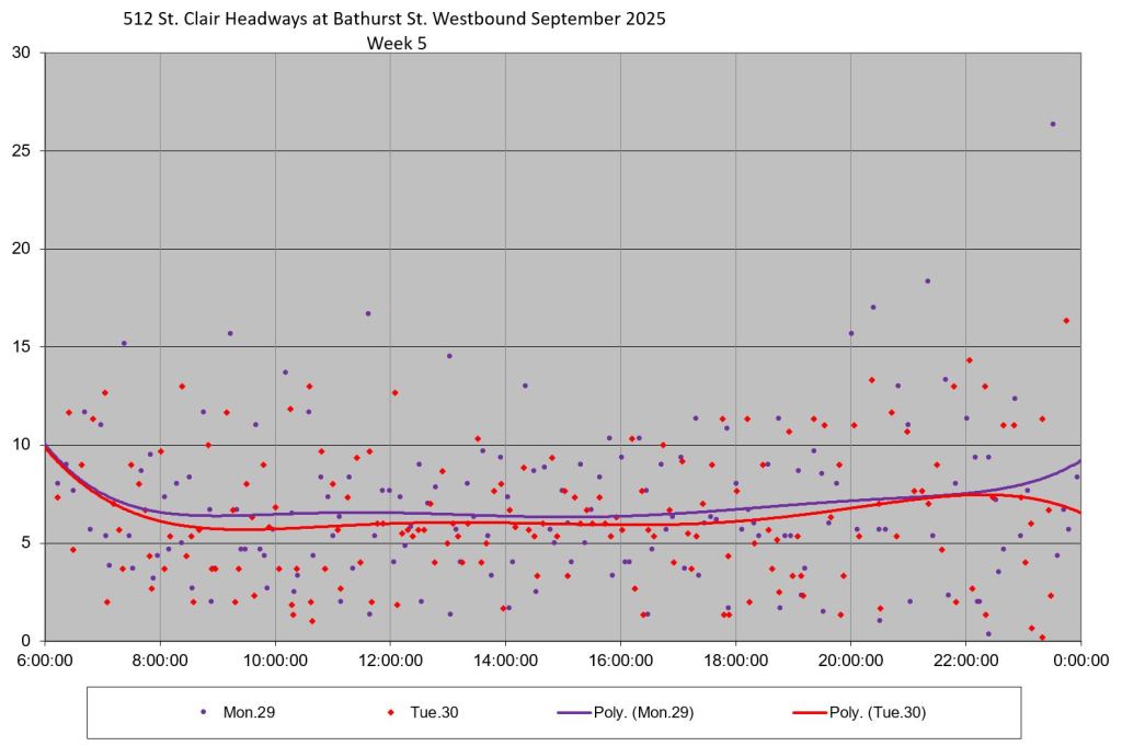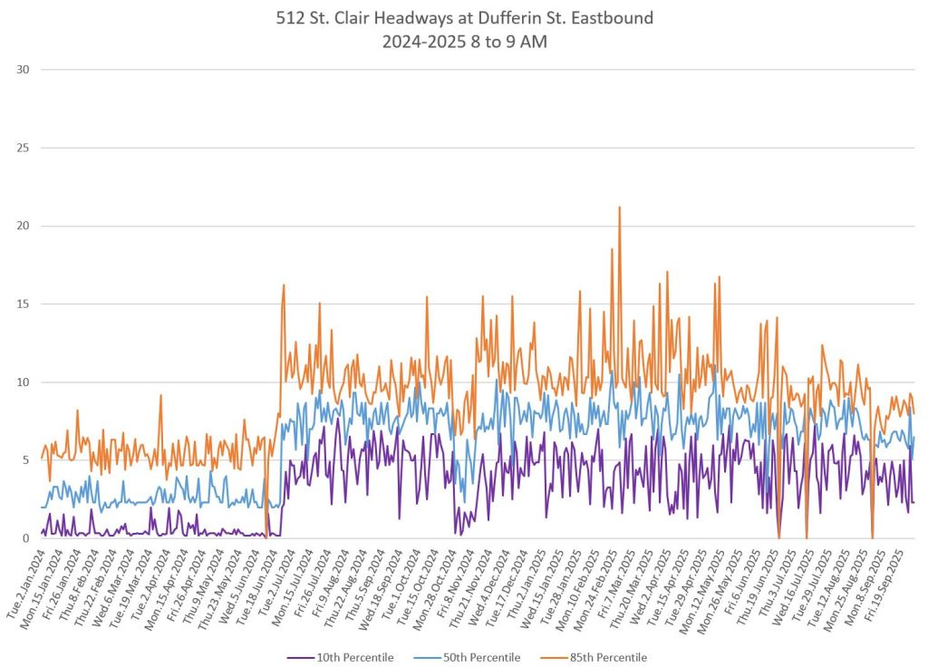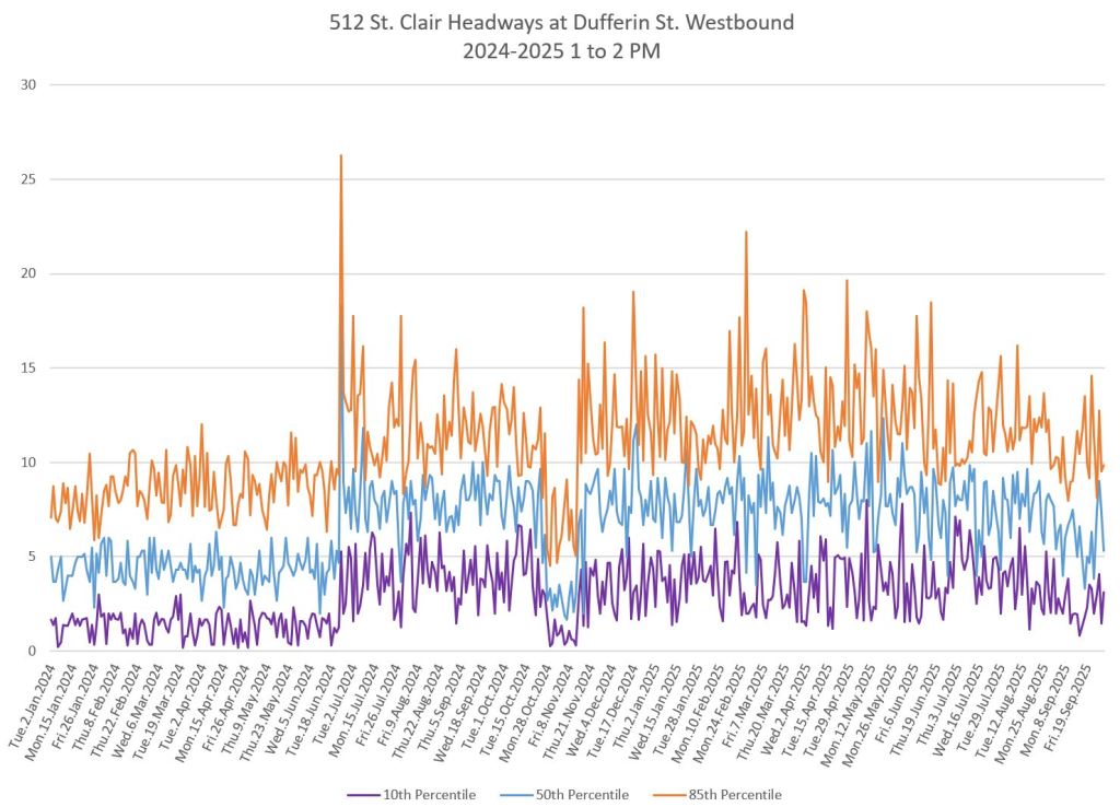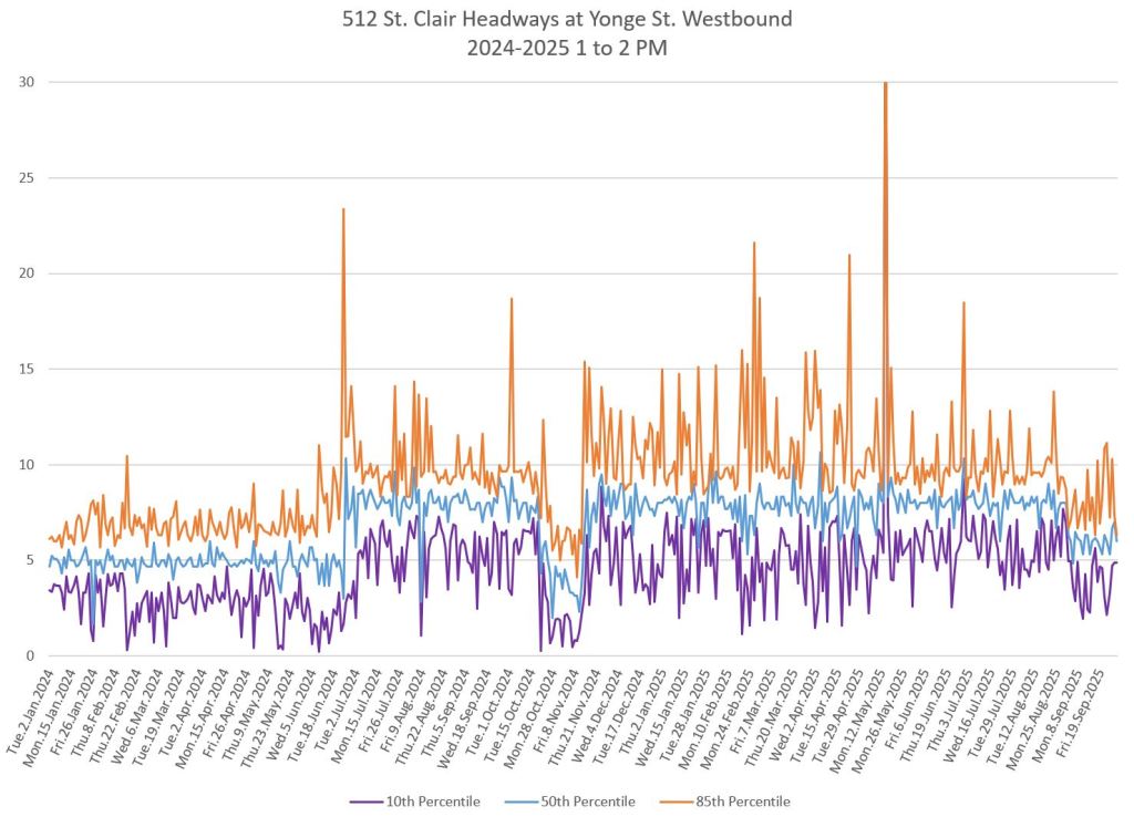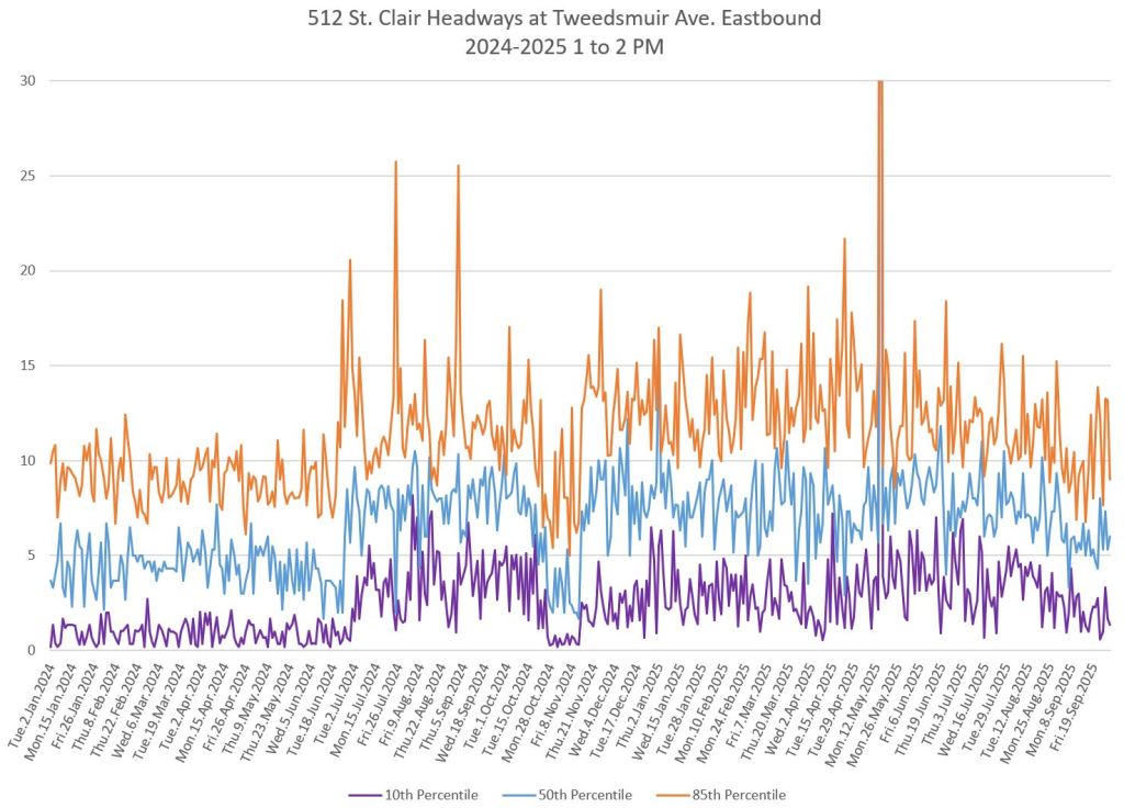 The 512 St. Clair car received improved service in September 2025, and this article updates the charts with headway stats to September 30 showing the combined effect of more service and route management.