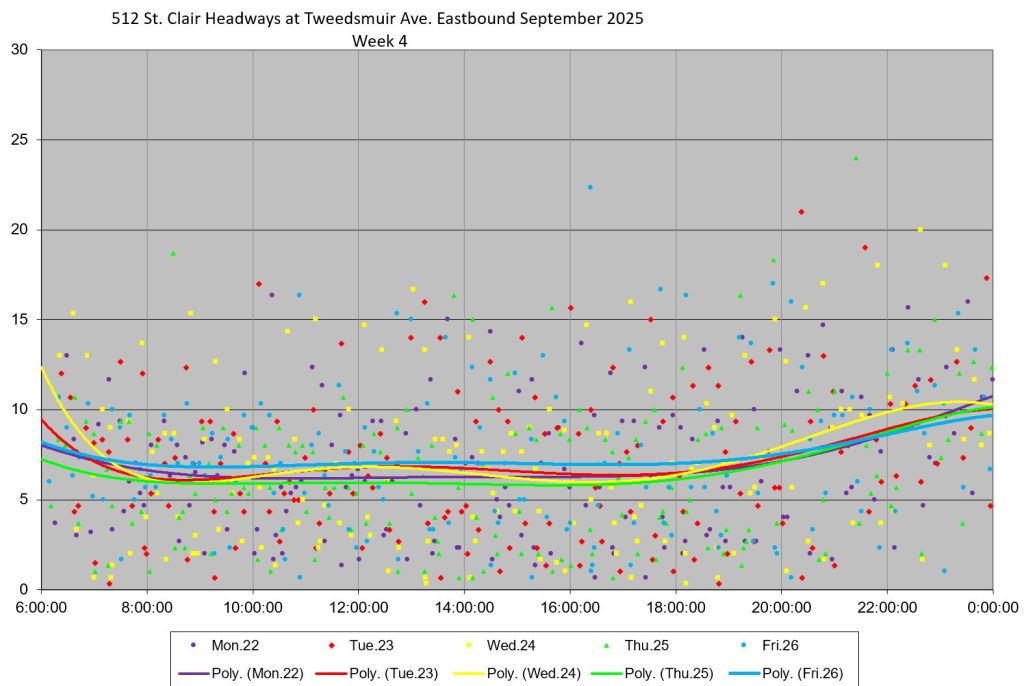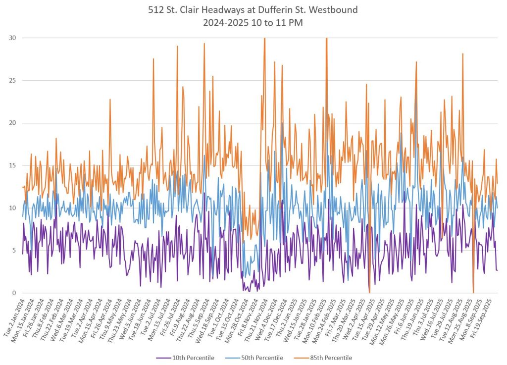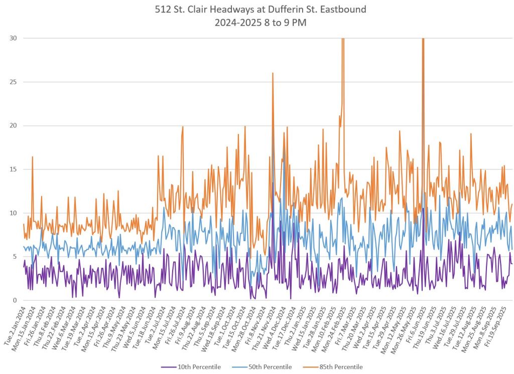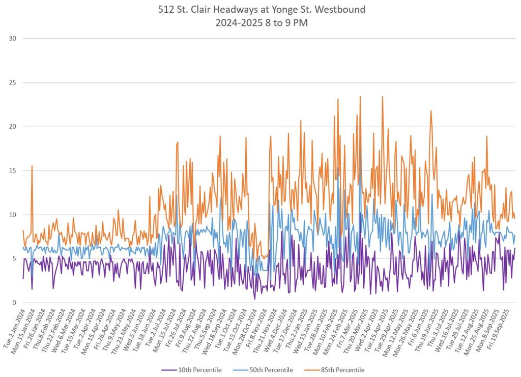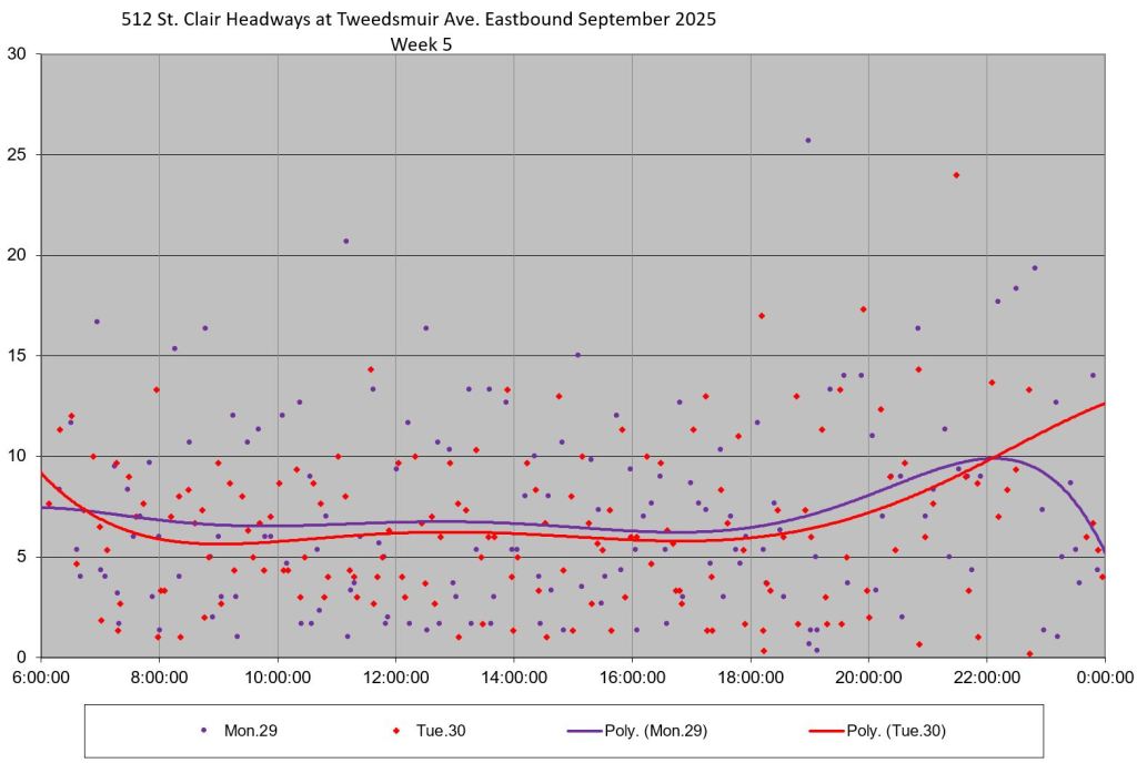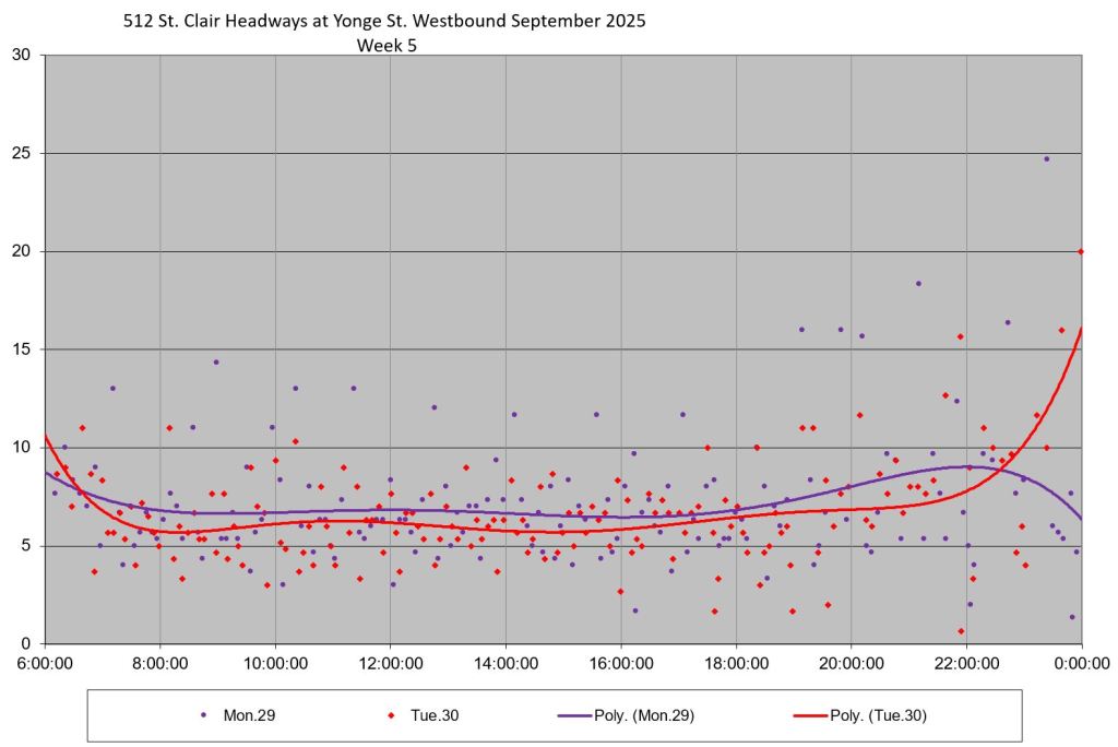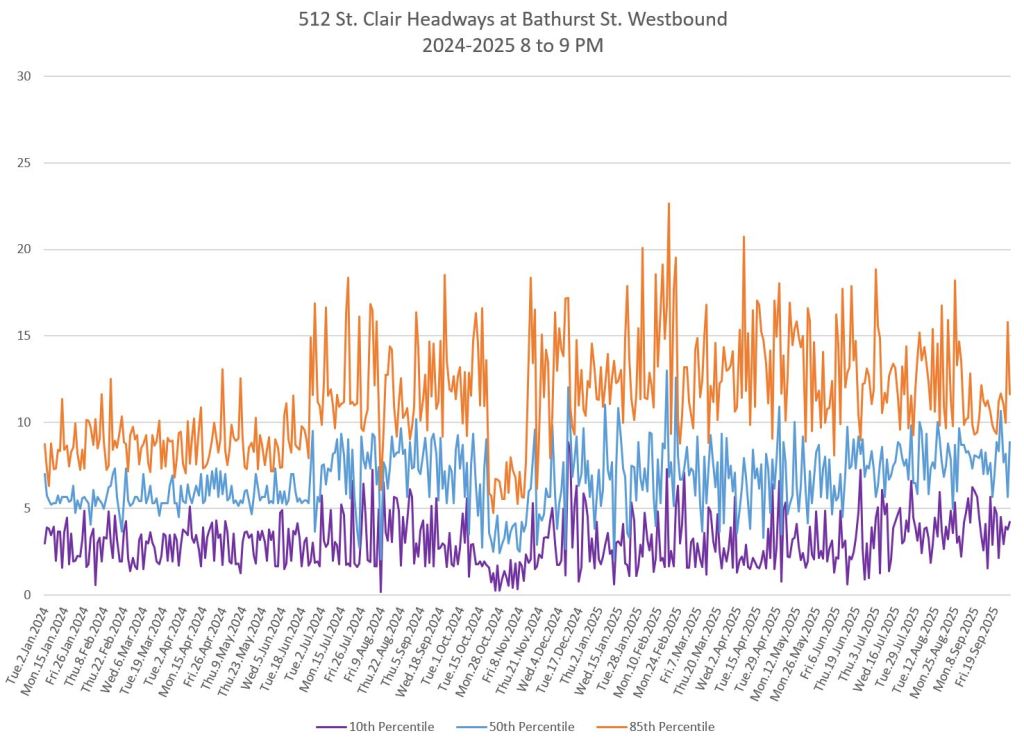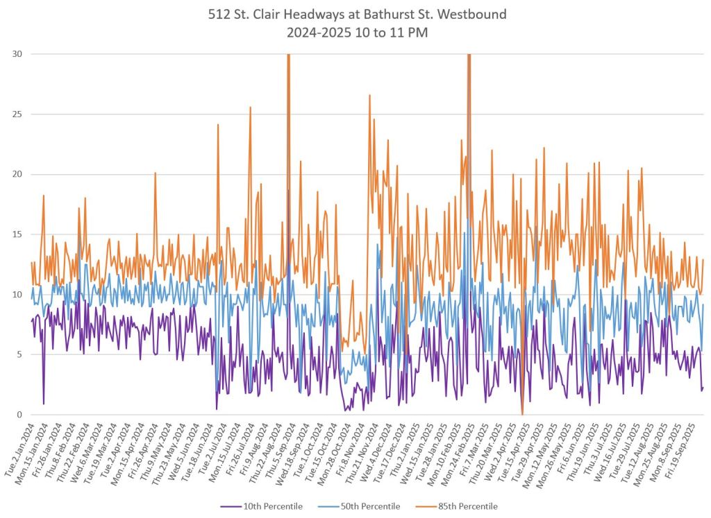 The 512 St. Clair car received improved service in September 2025, and this article updates the charts with headway stats to September 30 showing the combined effect of more service and route management.