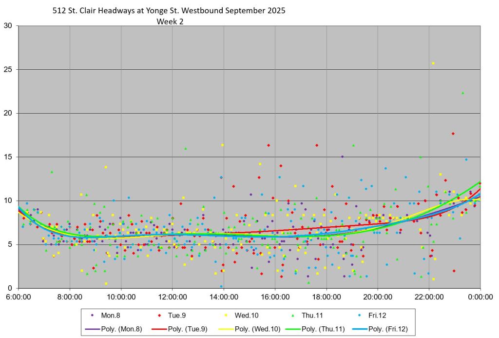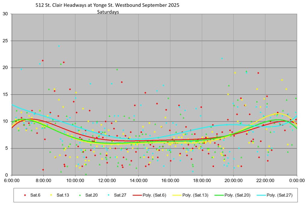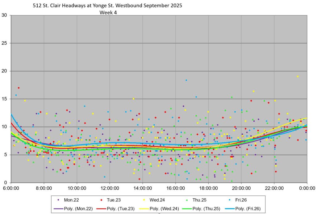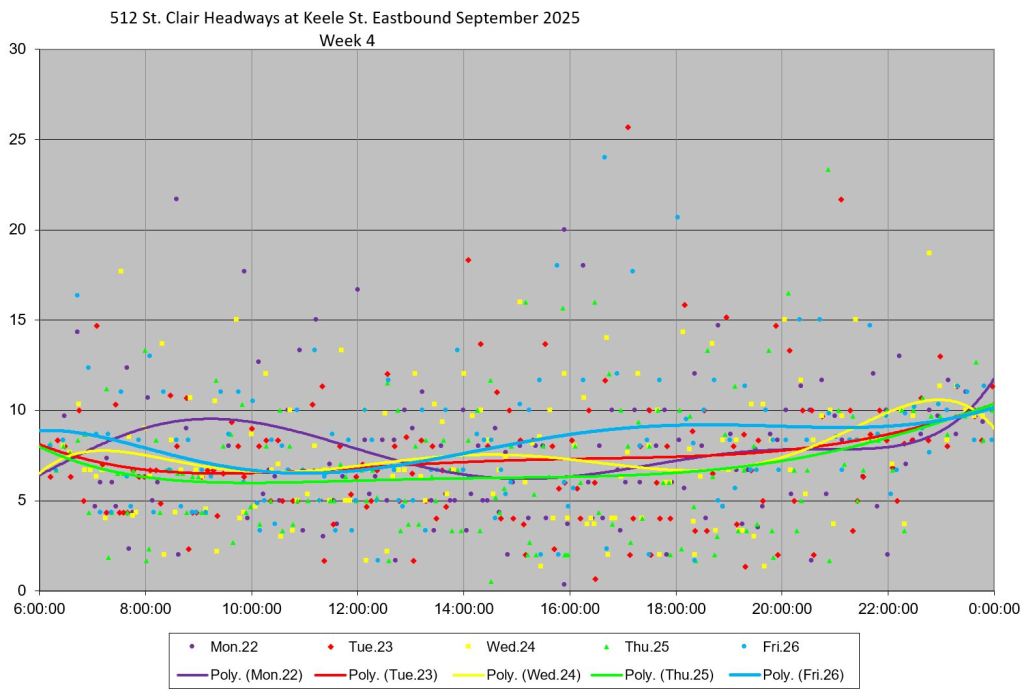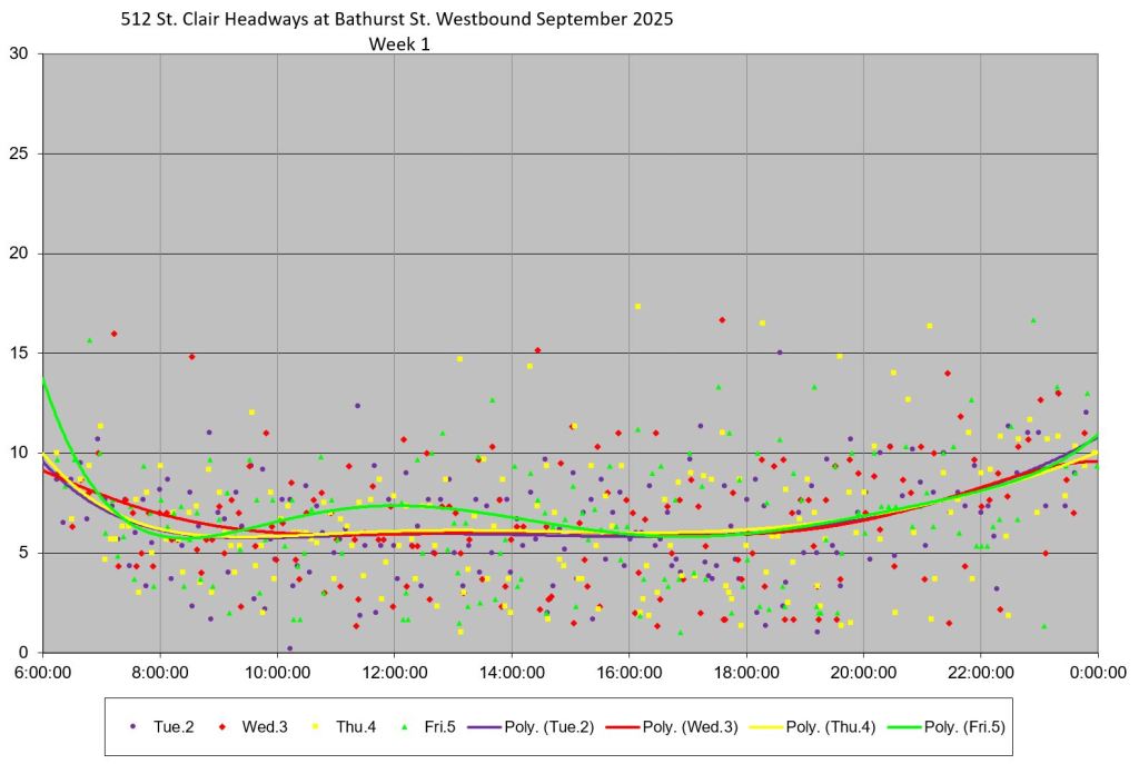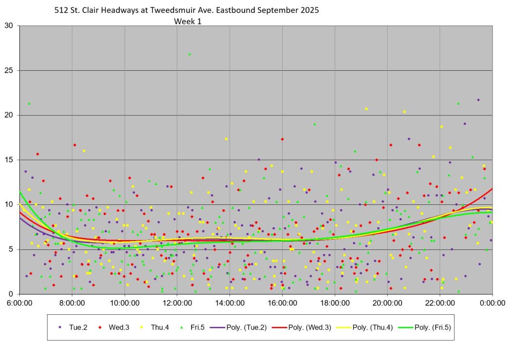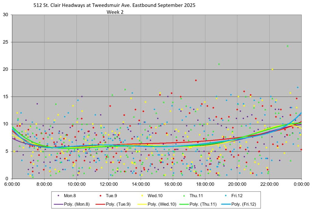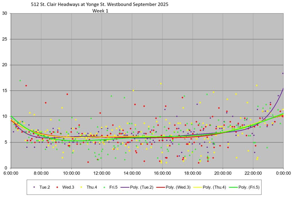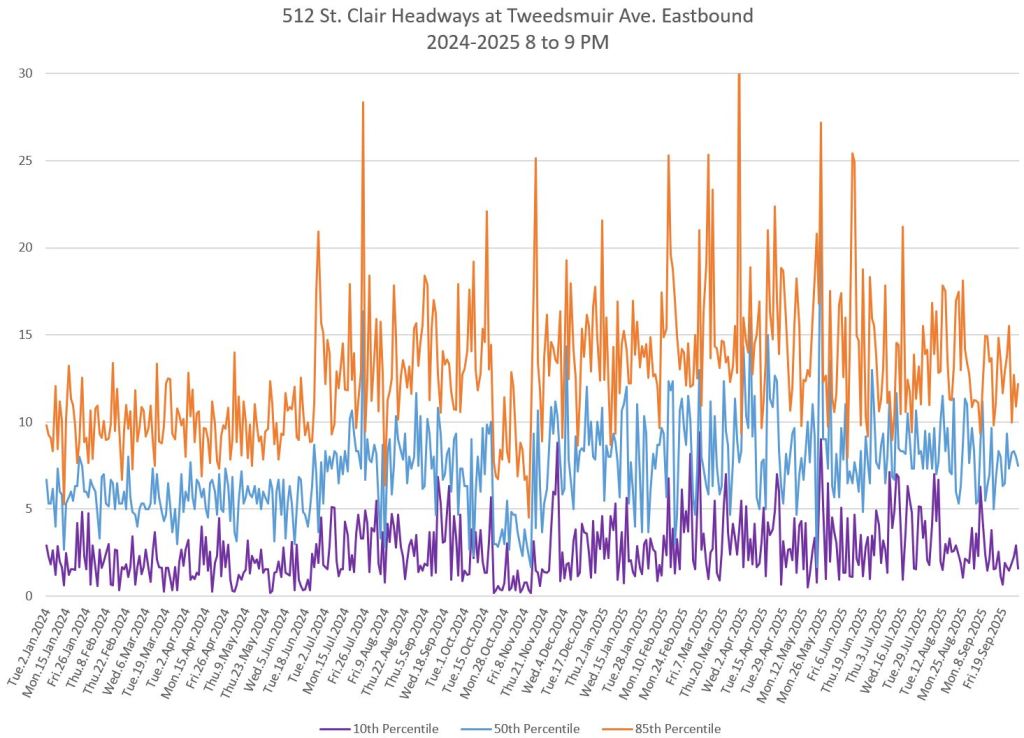The 512 St. Clair car received improved service in September 2025, and this article updates the charts with headway stats to September 30 showing the combined effect of more service and route management.